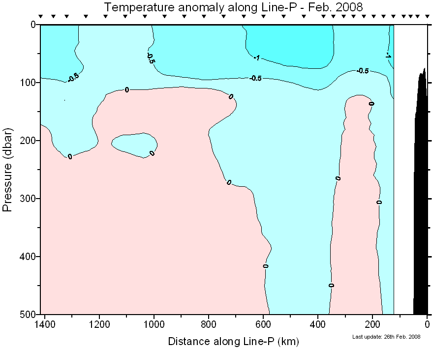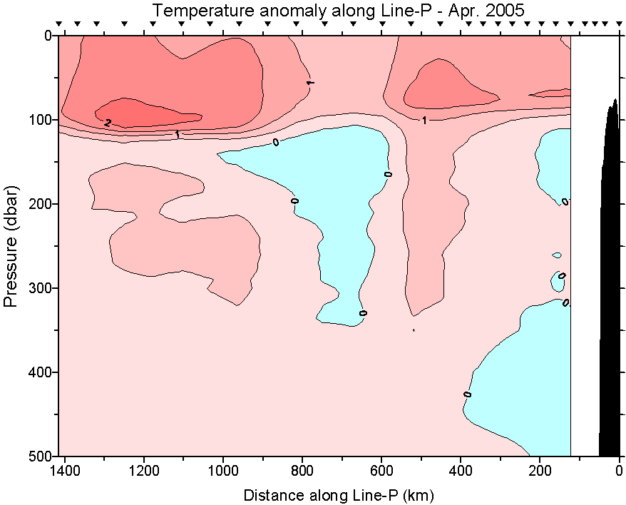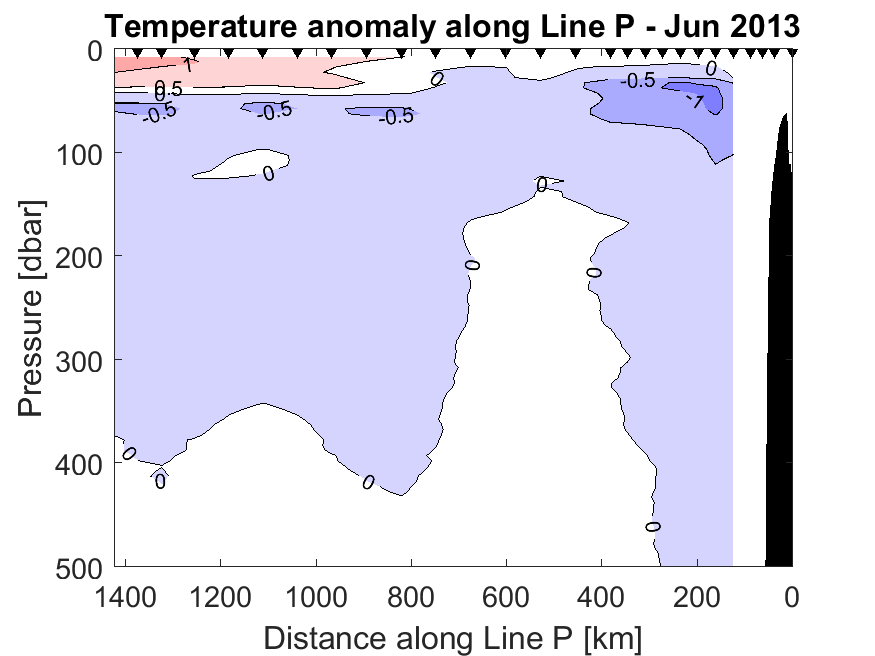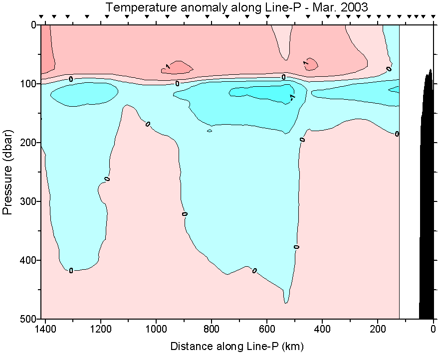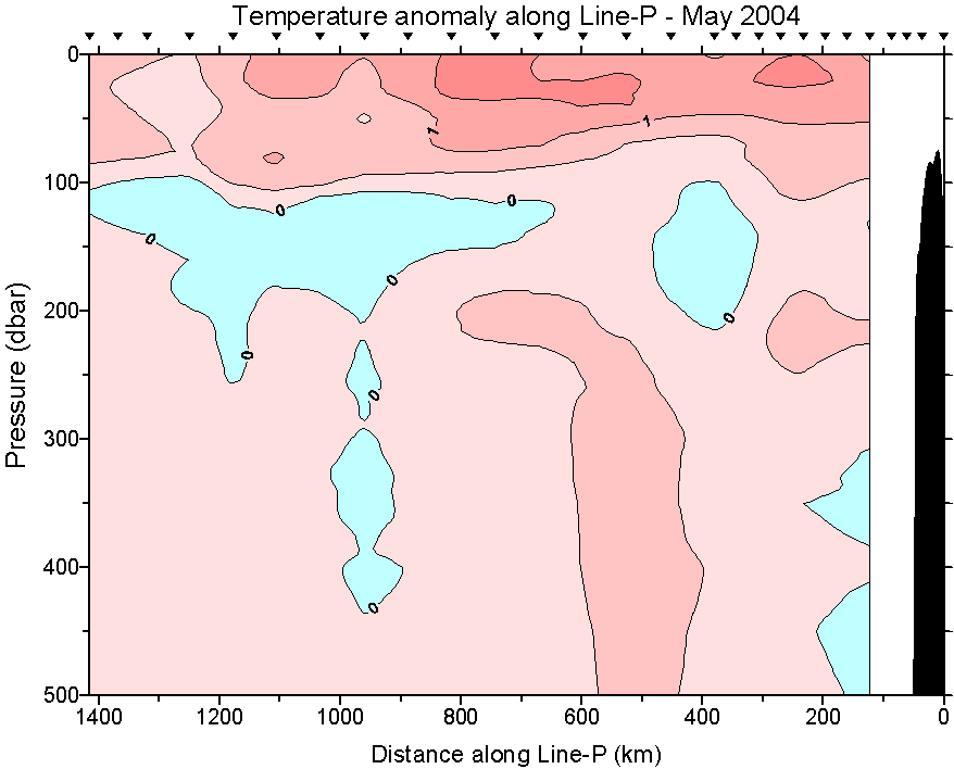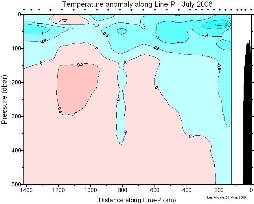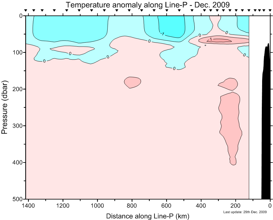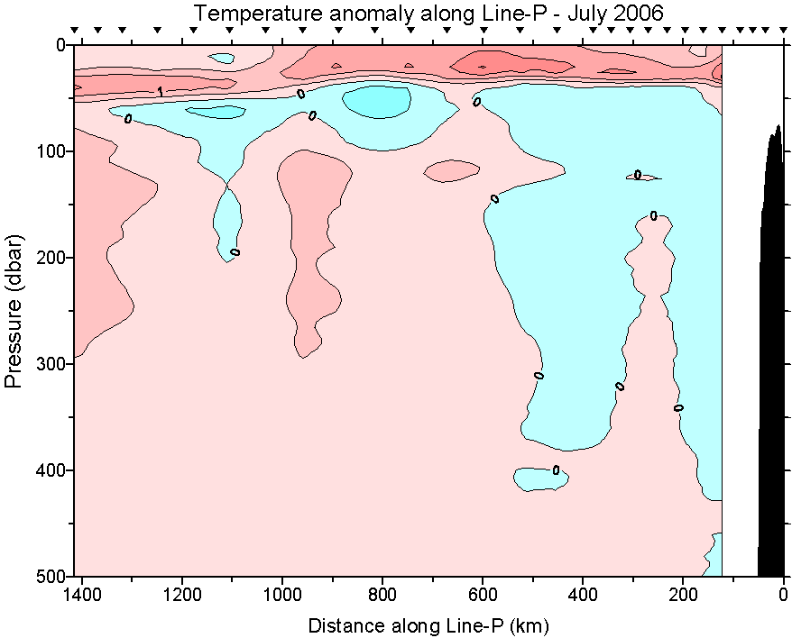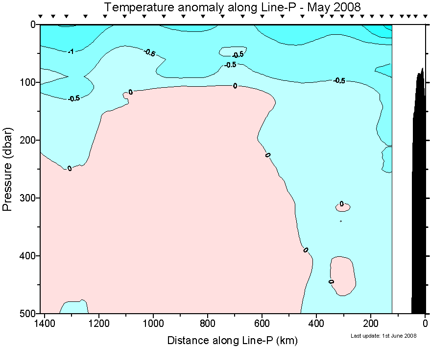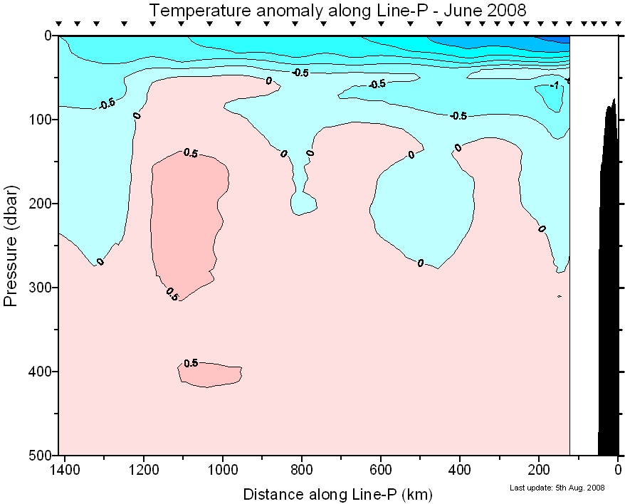 Pour le mois et l'année en cours, les sections sont calculées en utilisant les données disponibles à ce jour. Ces sections sont susceptibles d'être modifiées. Les versions définitives seront publiées lorsque toutes les données seront disponibles. Les anomalies sont calculées par rapport à la climatologie de la ligne P.