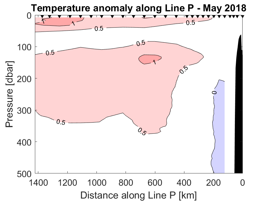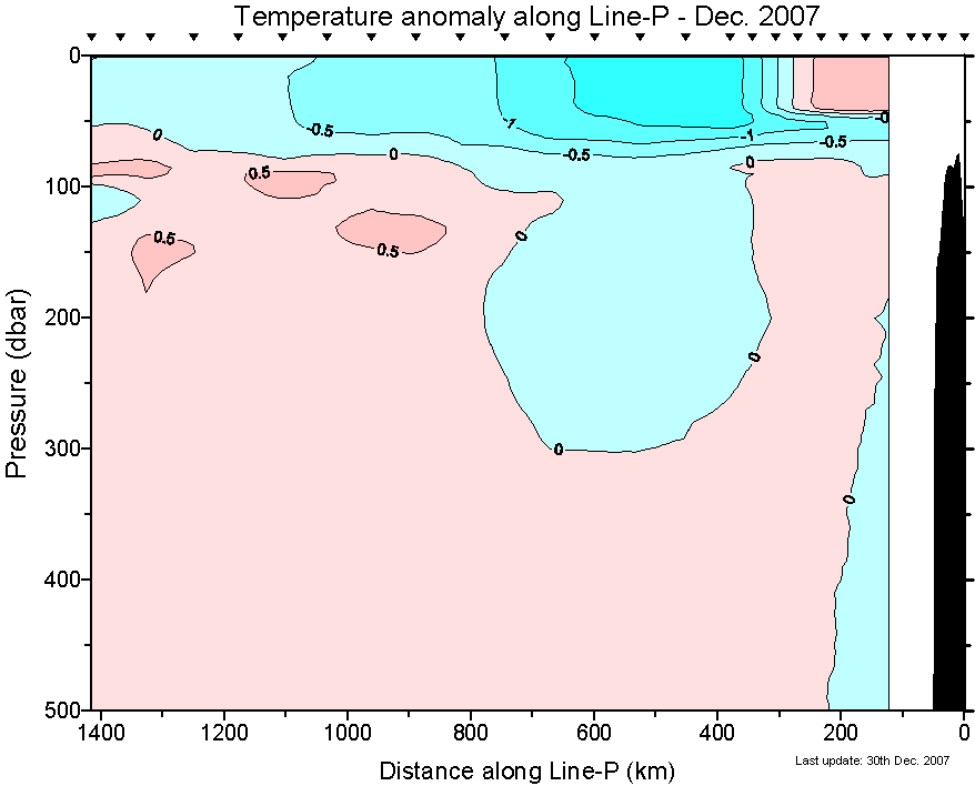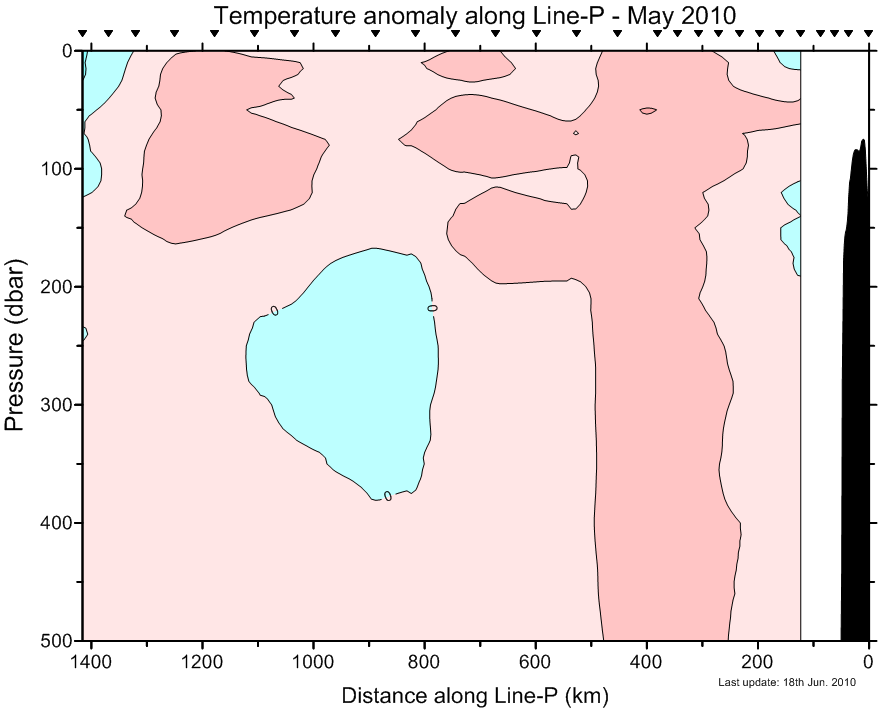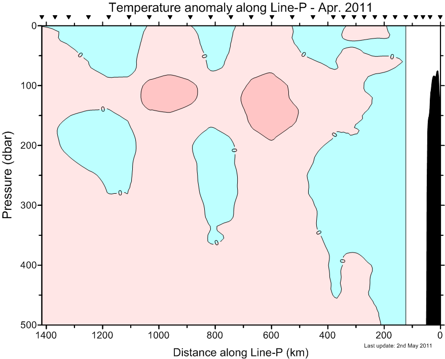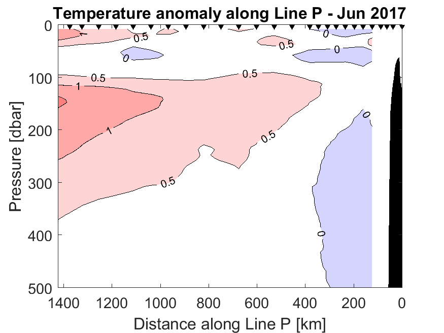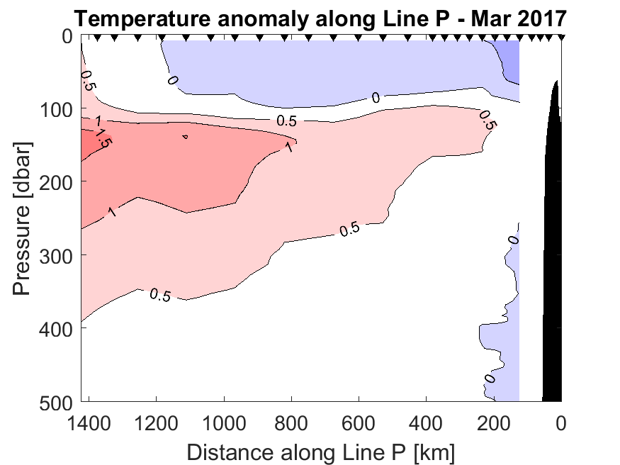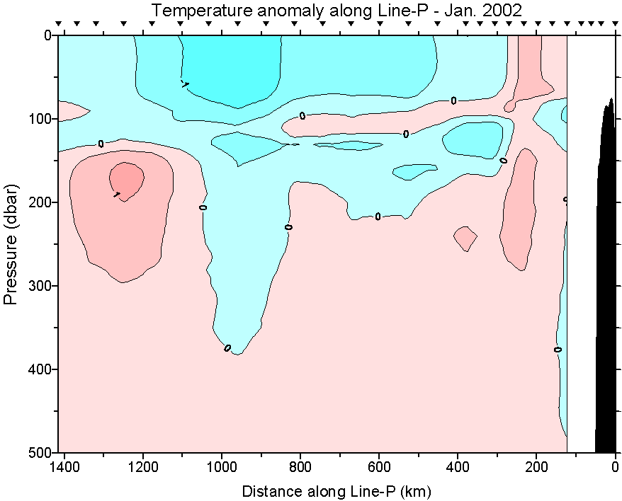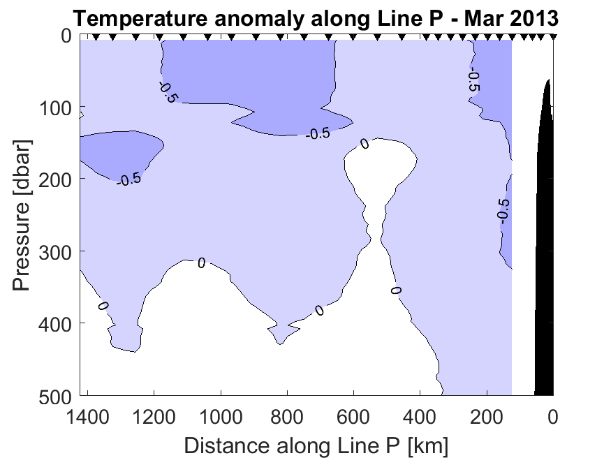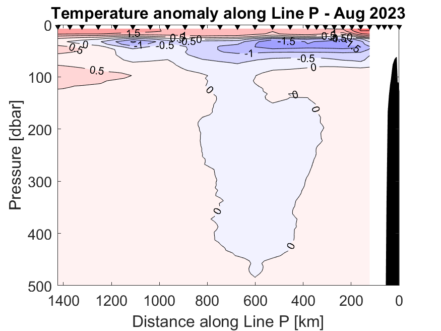 Pour le mois et l'année en cours, les sections sont calculées en utilisant les données disponibles à ce jour. Ces sections sont susceptibles d'être modifiées. Les versions définitives seront publiées lorsque toutes les données seront disponibles. Les anomalies sont calculées par rapport à la climatologie de la ligne P.