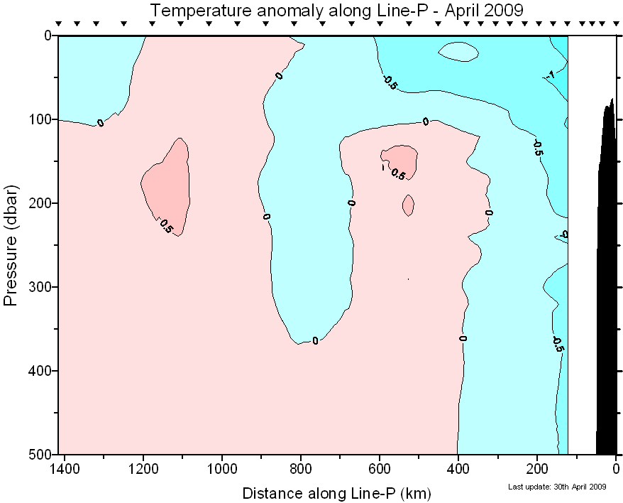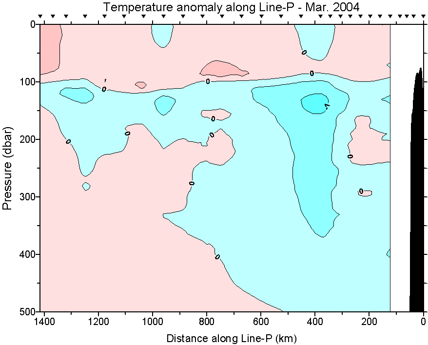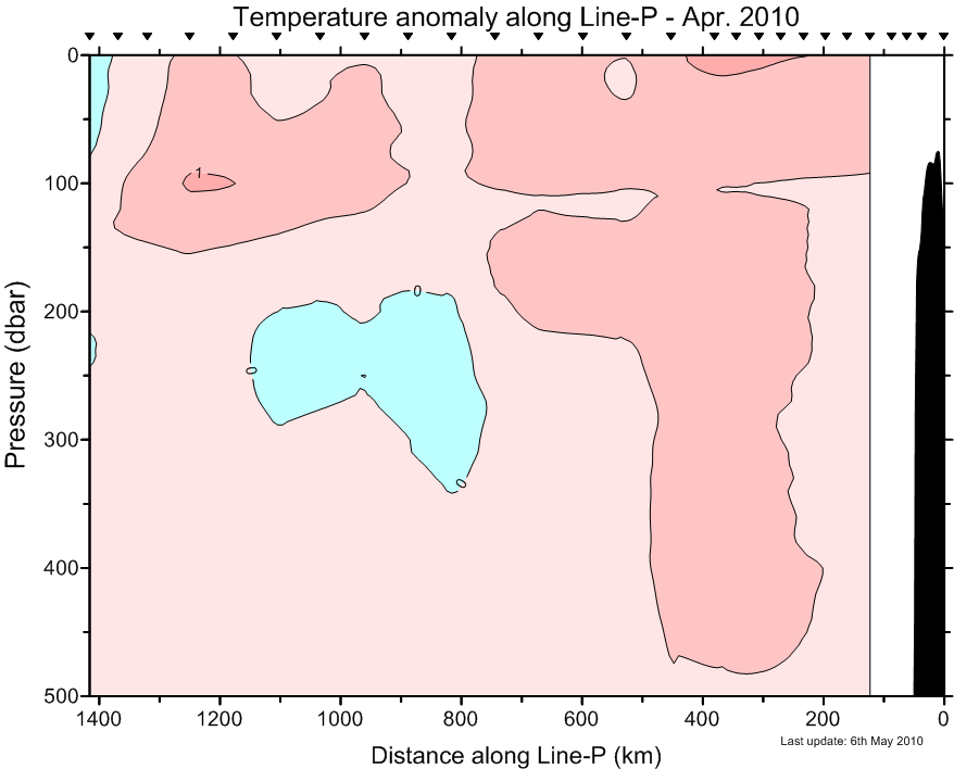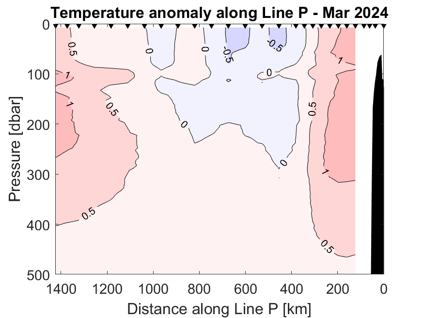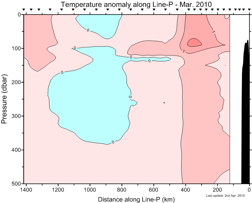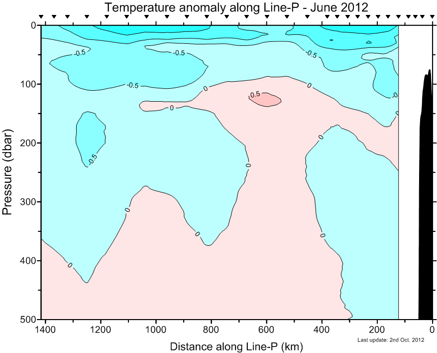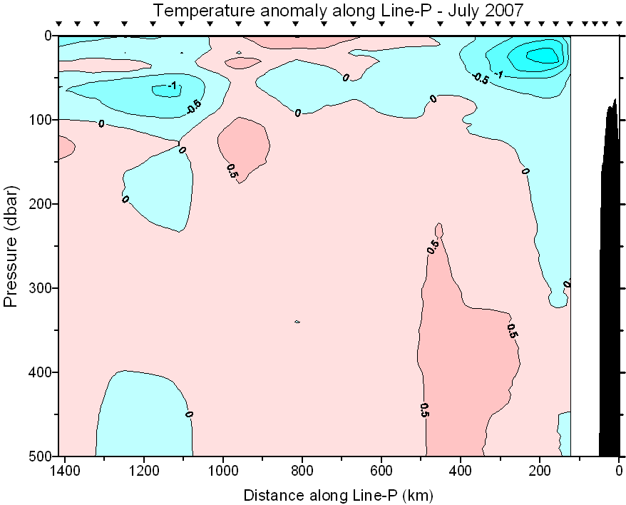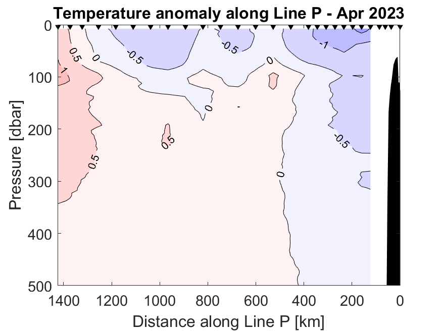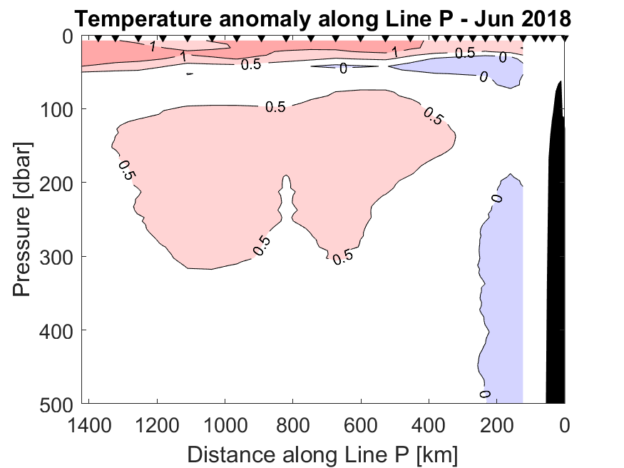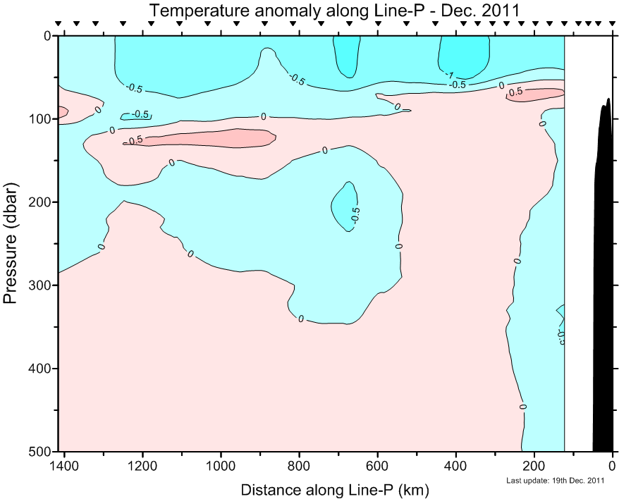 Pour le mois et l'année en cours, les sections sont calculées en utilisant les données disponibles à ce jour. Ces sections sont susceptibles d'être modifiées. Les versions définitives seront publiées lorsque toutes les données seront disponibles. Les anomalies sont calculées par rapport à la climatologie de la ligne P.