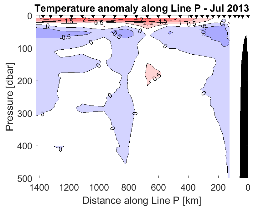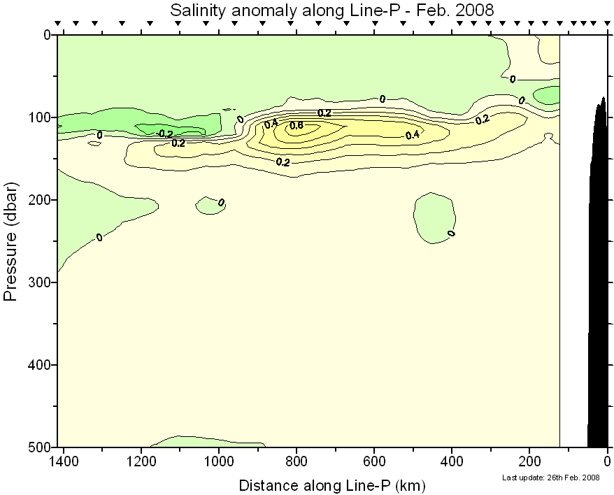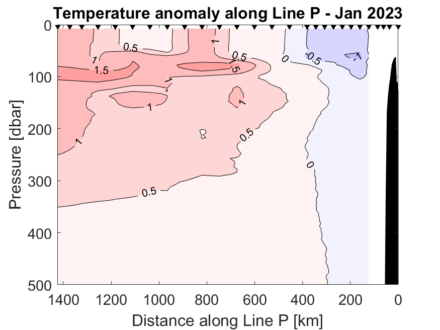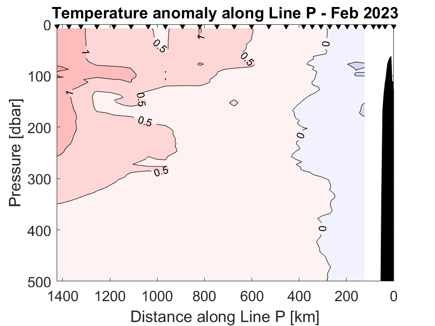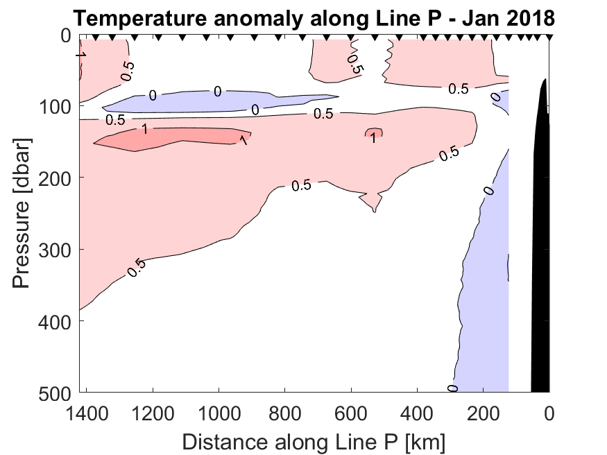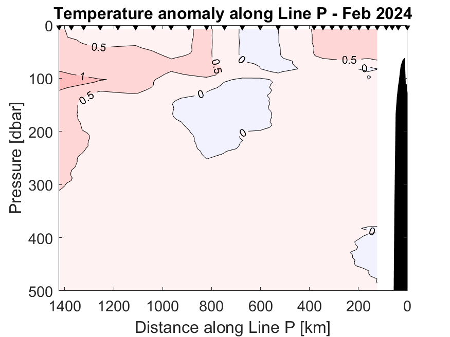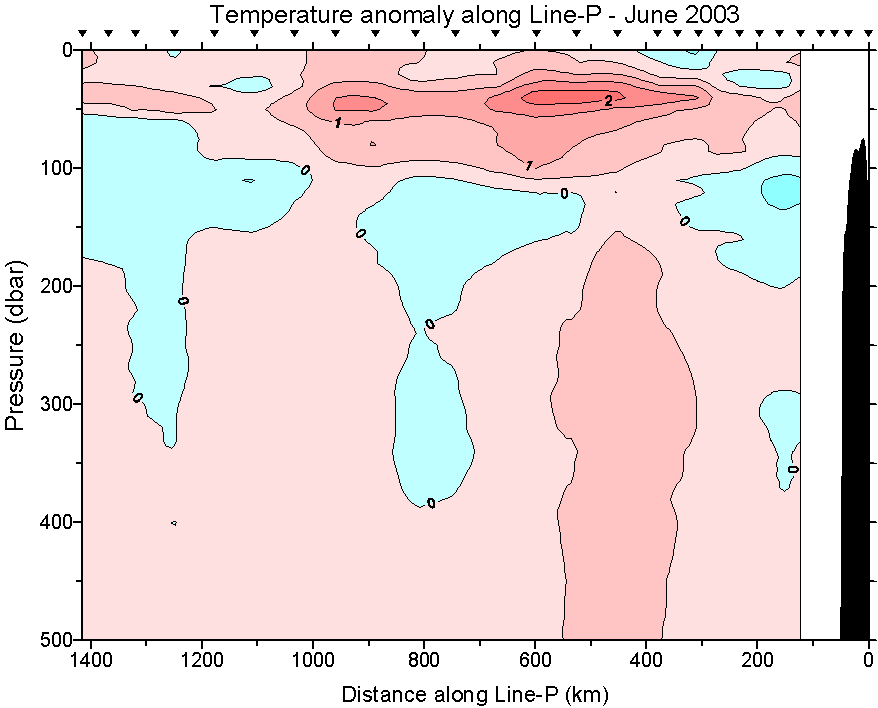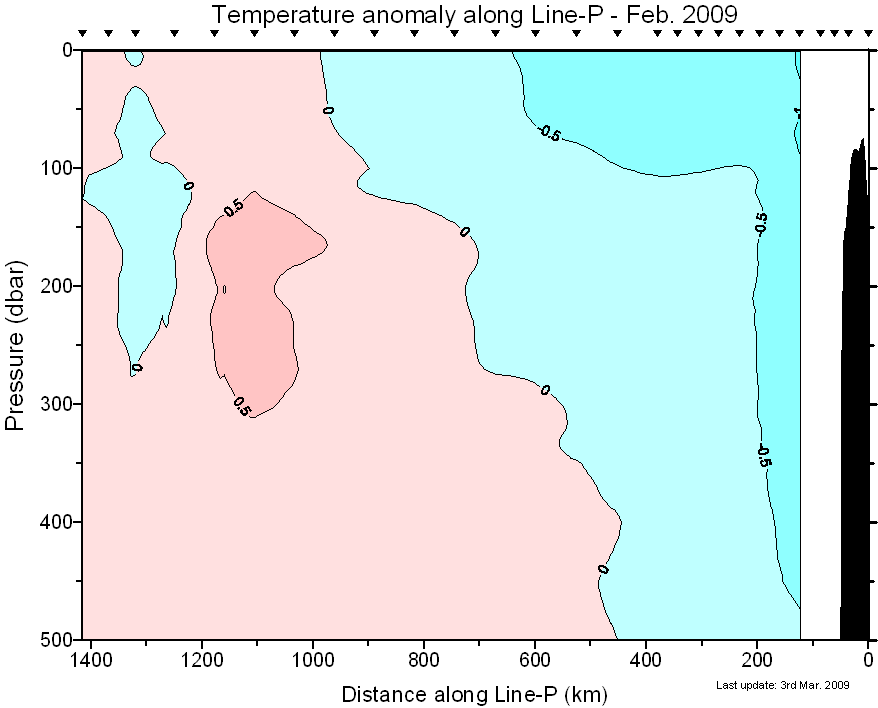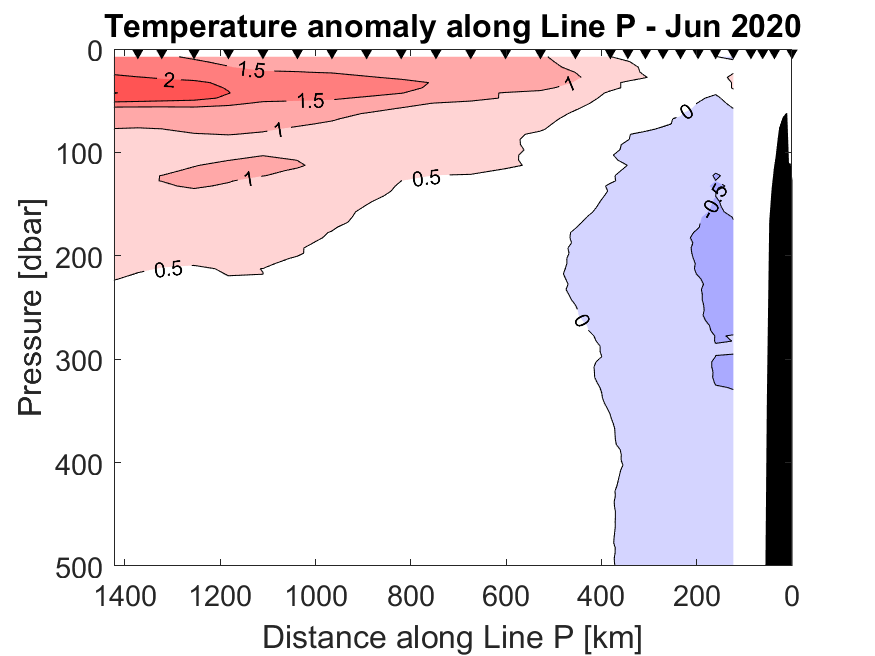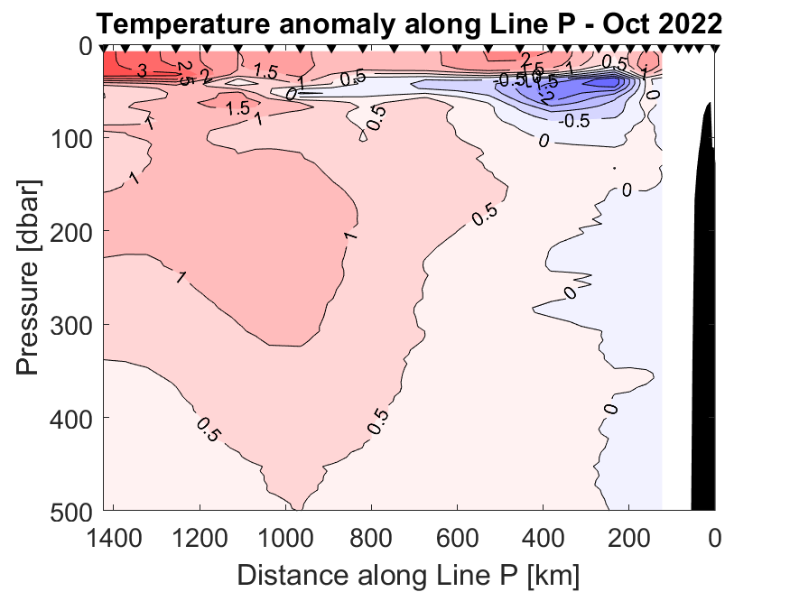 Pour le mois et l'année en cours, les sections sont calculées en utilisant les données disponibles à ce jour. Ces sections sont susceptibles d'être modifiées. Les versions définitives seront publiées lorsque toutes les données seront disponibles. Les anomalies sont calculées par rapport à la climatologie de la ligne P.
