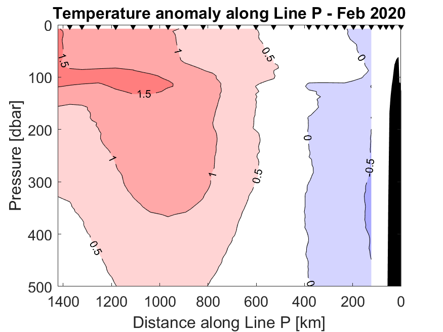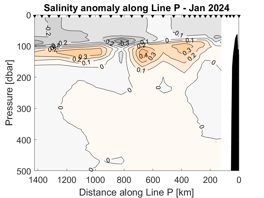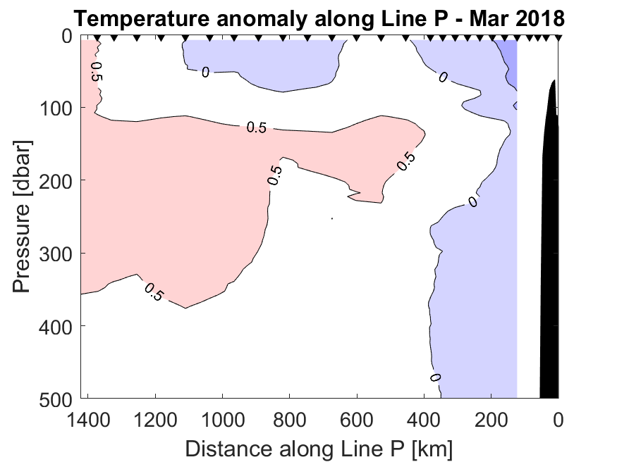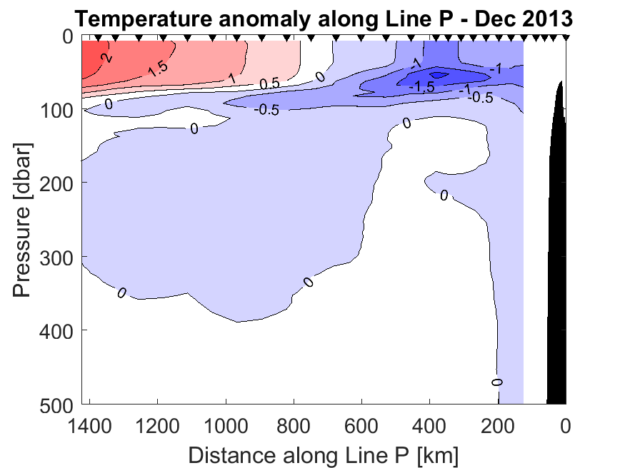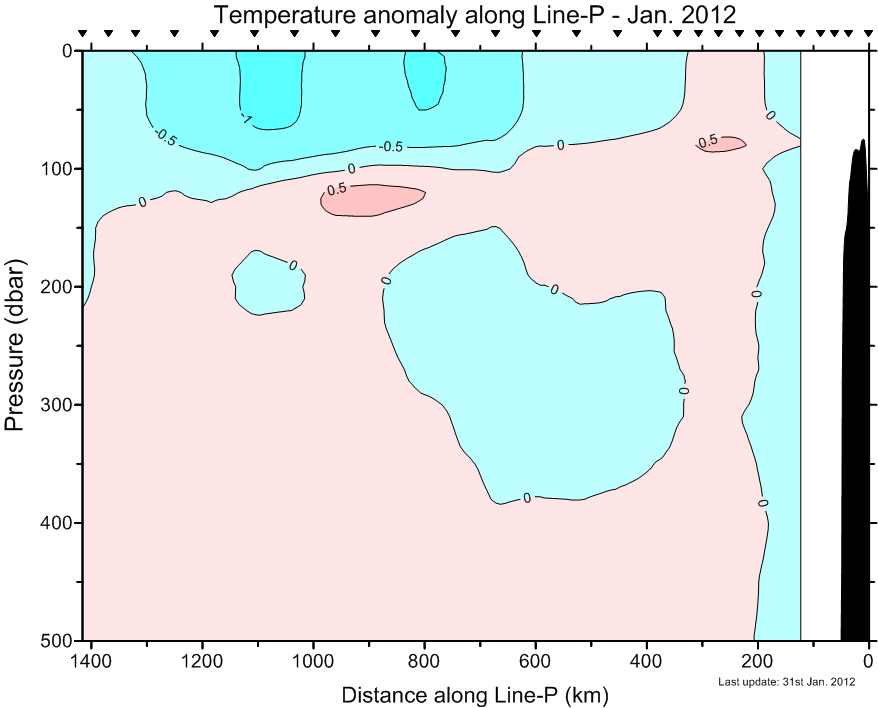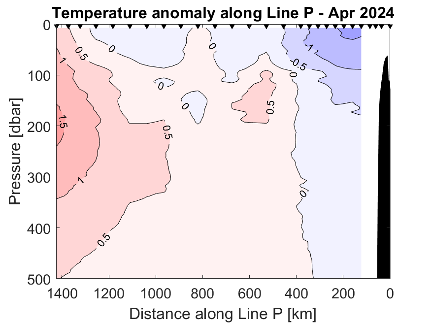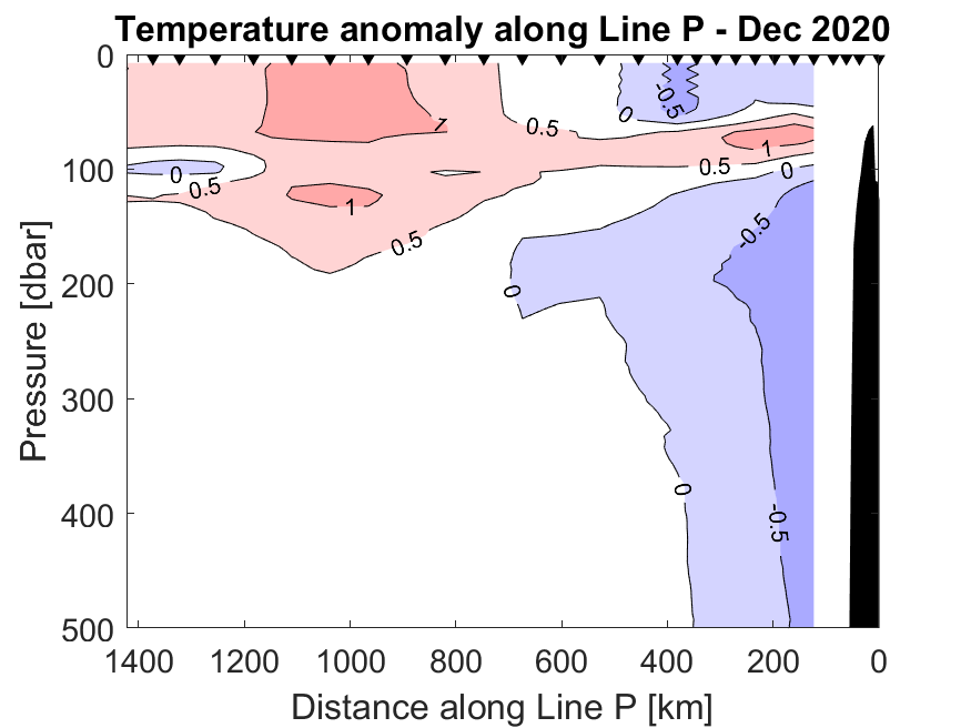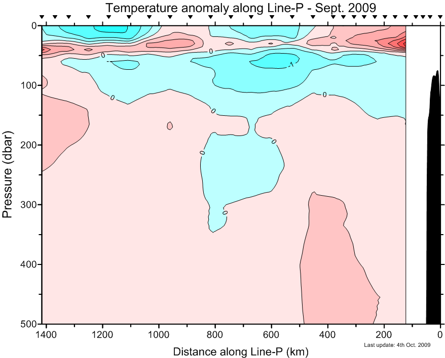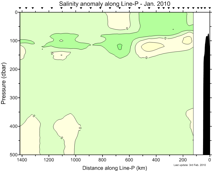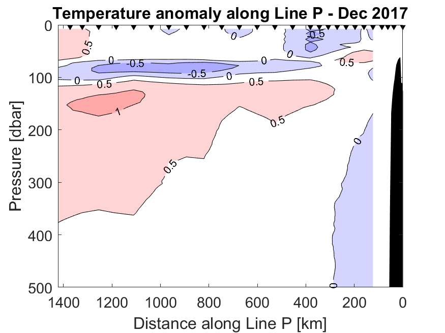 Pour le mois et l'année en cours, les sections sont calculées en utilisant les données disponibles à ce jour. Ces sections sont susceptibles d'être modifiées. Les versions définitives seront publiées lorsque toutes les données seront disponibles. Les anomalies sont calculées par rapport à la climatologie de la ligne P.
