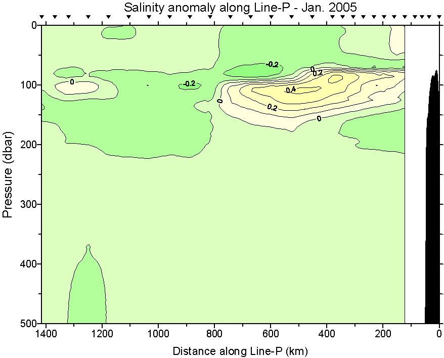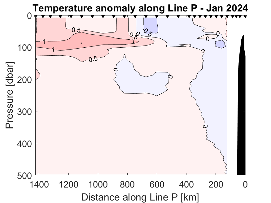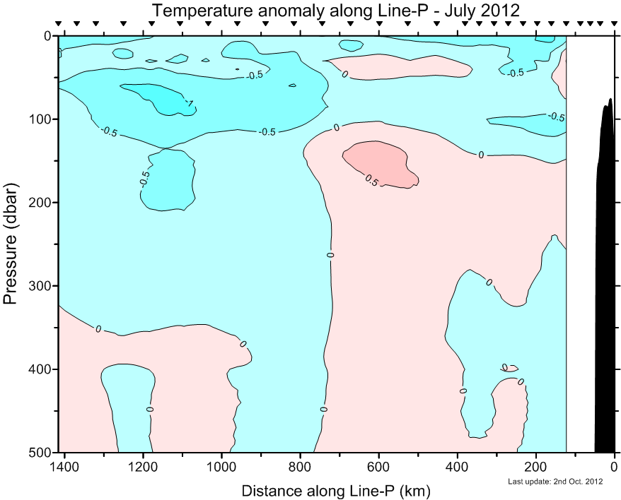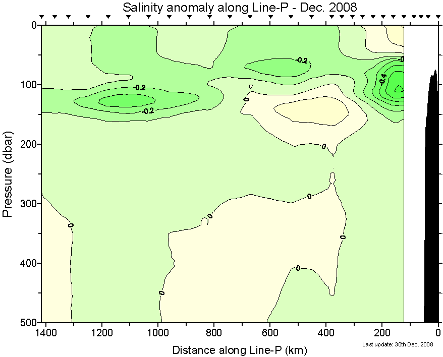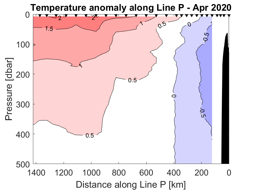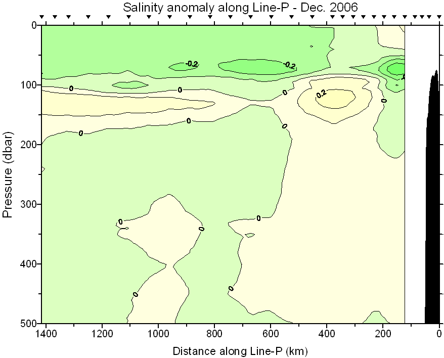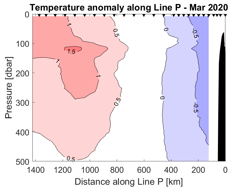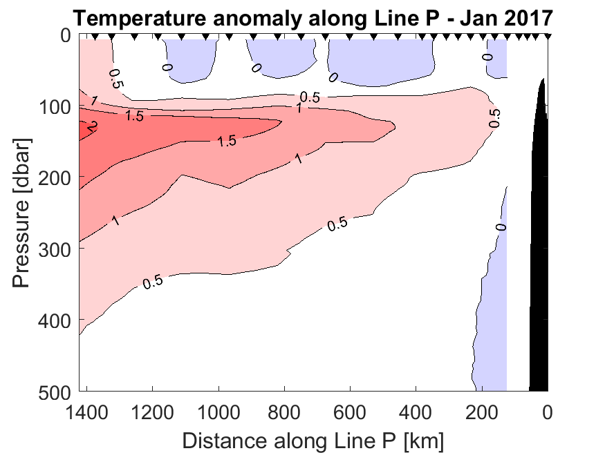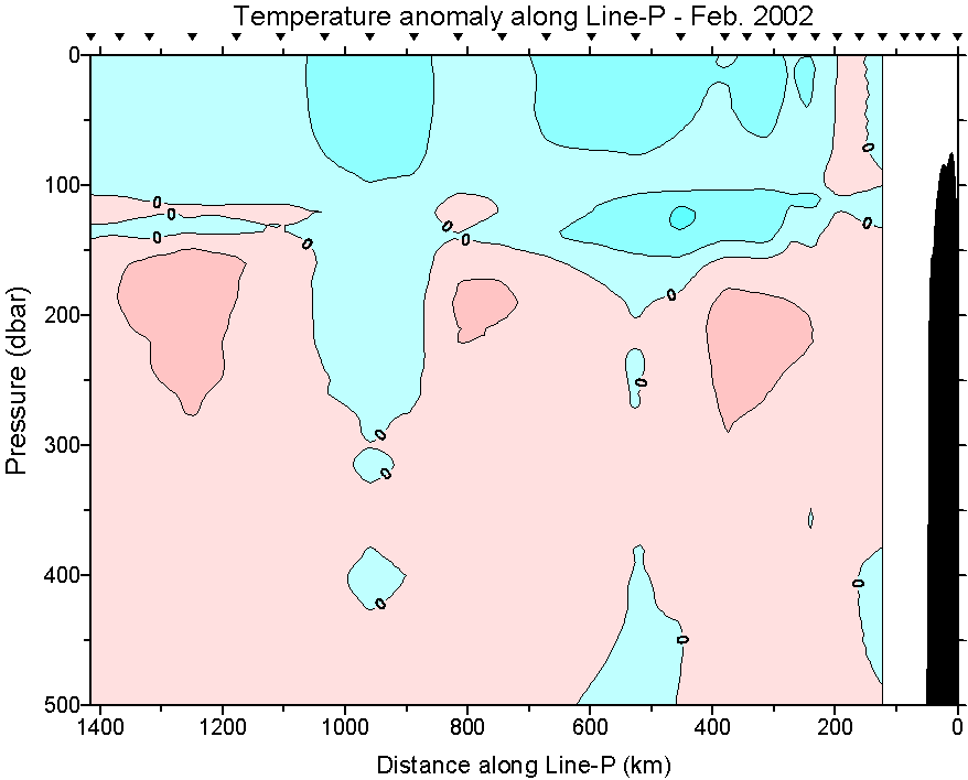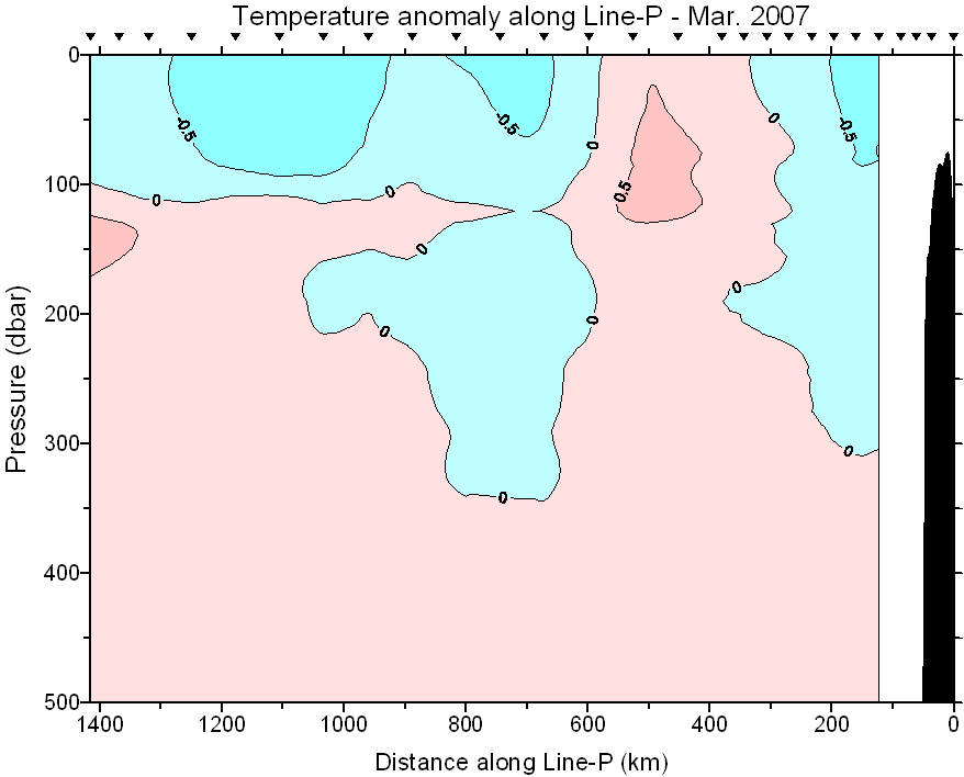 Pour le mois et l'année en cours, les sections sont calculées en utilisant les données disponibles à ce jour. Ces sections sont susceptibles d'être modifiées. Les versions définitives seront publiées lorsque toutes les données seront disponibles. Les anomalies sont calculées par rapport à la climatologie de la ligne P.
