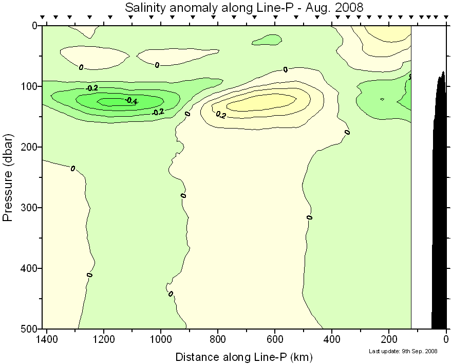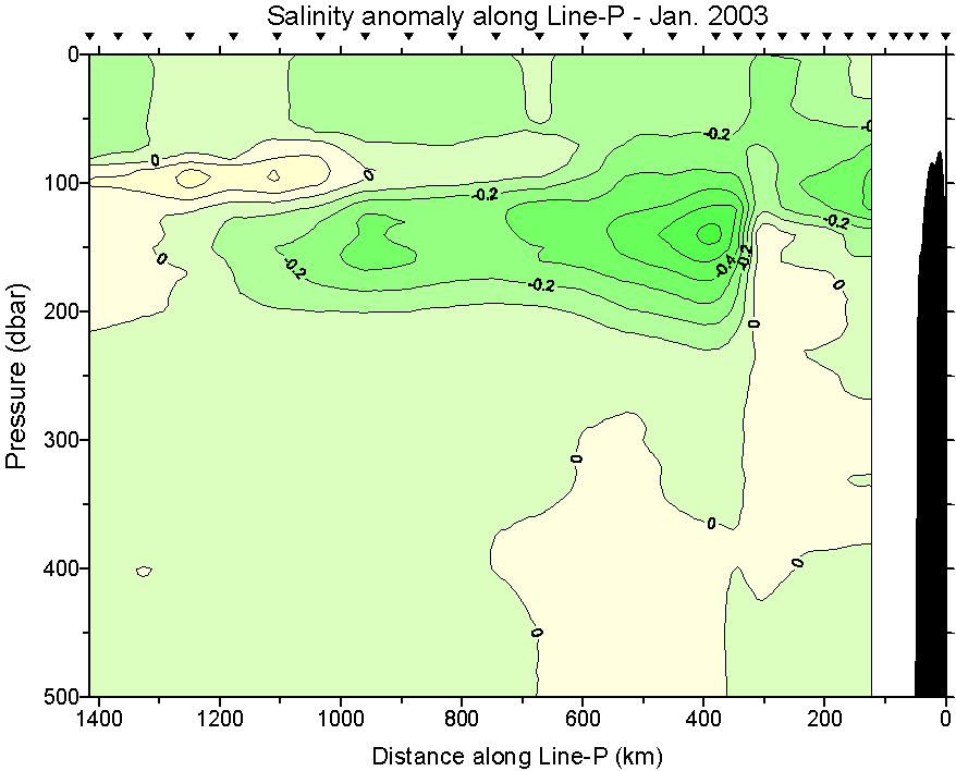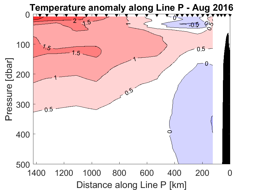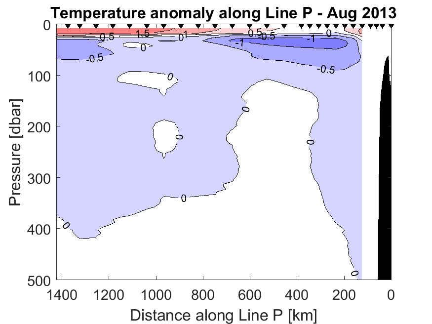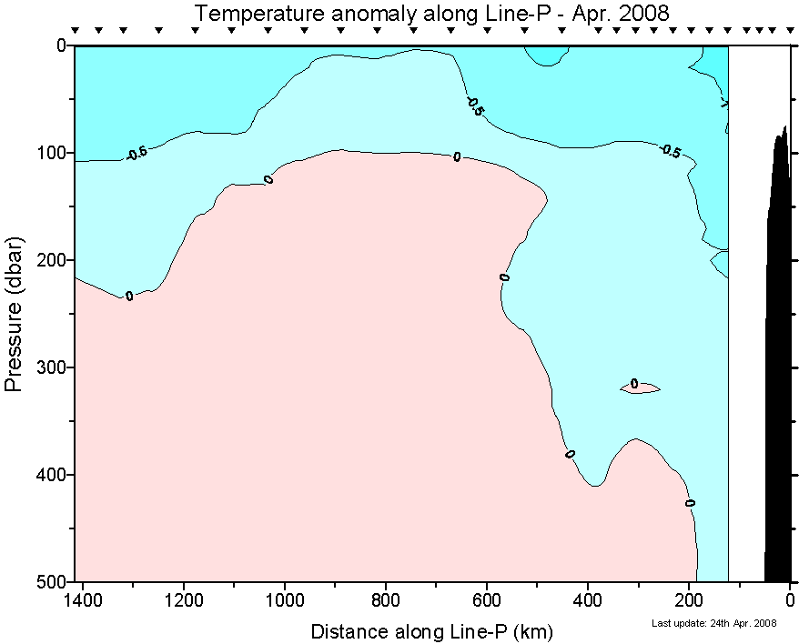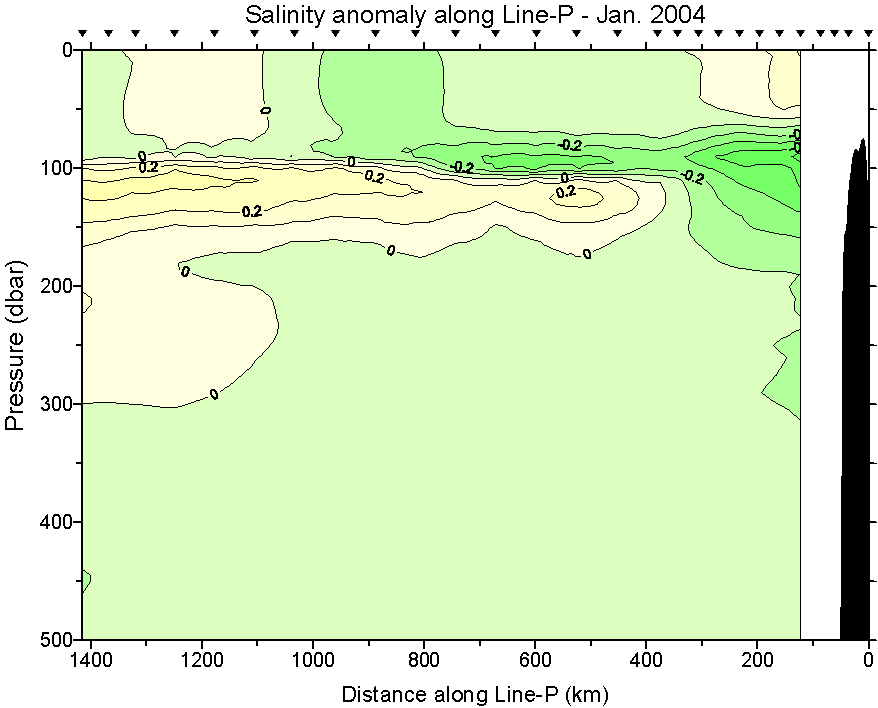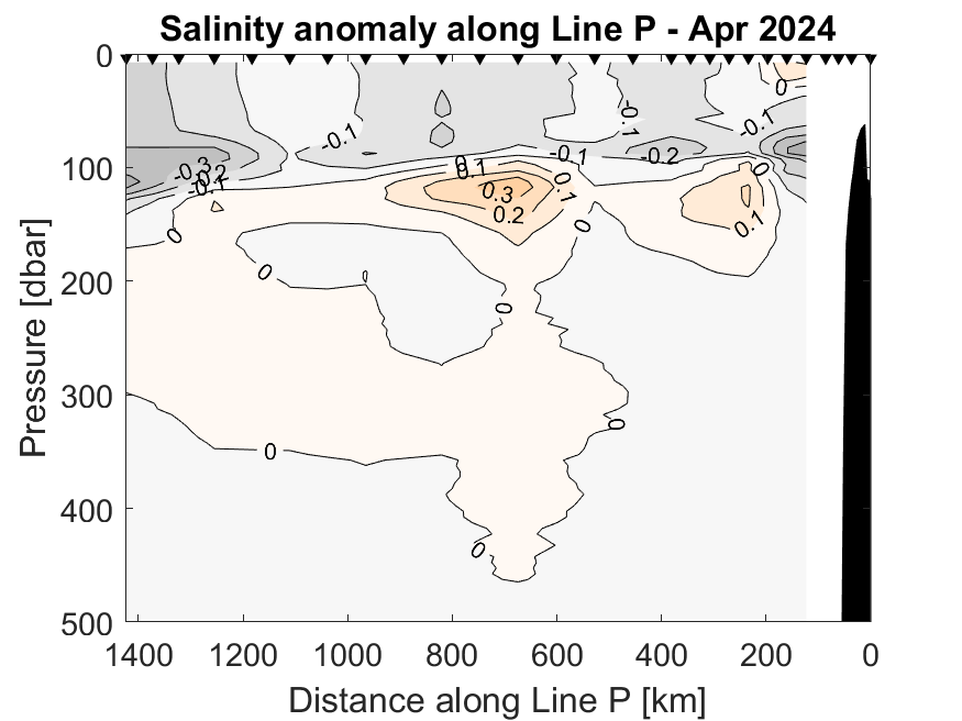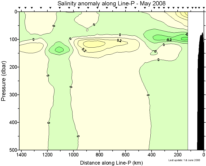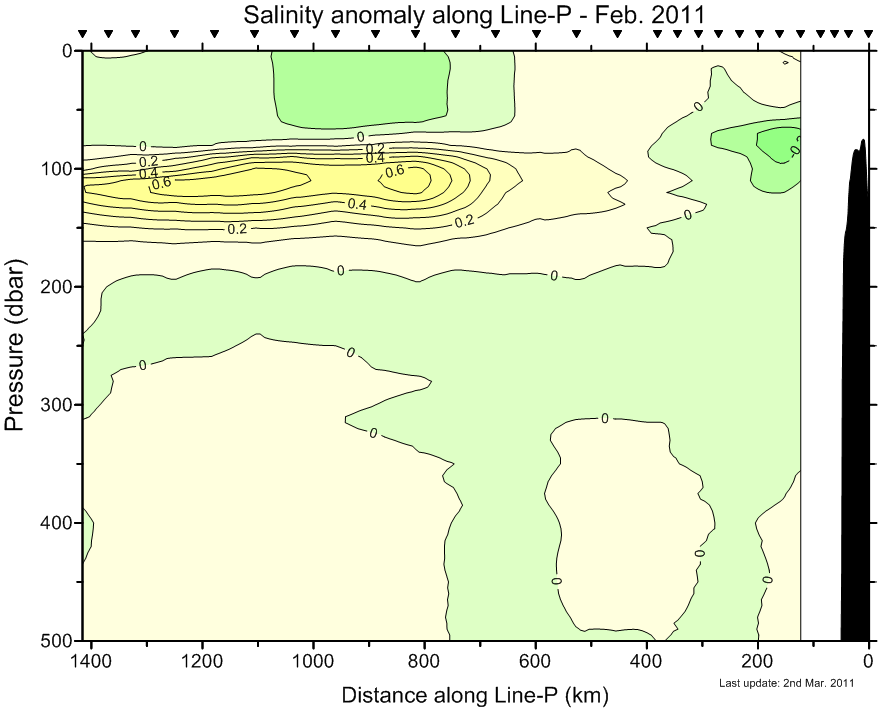Pour le mois et l'année en cours, les sections sont calculées en utilisant les données disponibles à ce jour. Ces sections sont susceptibles d'être modifiées. Les versions définitives seront publiées lorsque toutes les données seront disponibles. Les anomalies sont calculées par rapport à la climatologie de la ligne P.