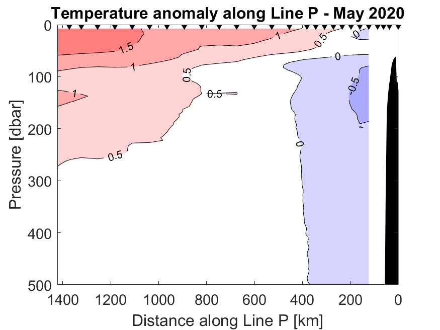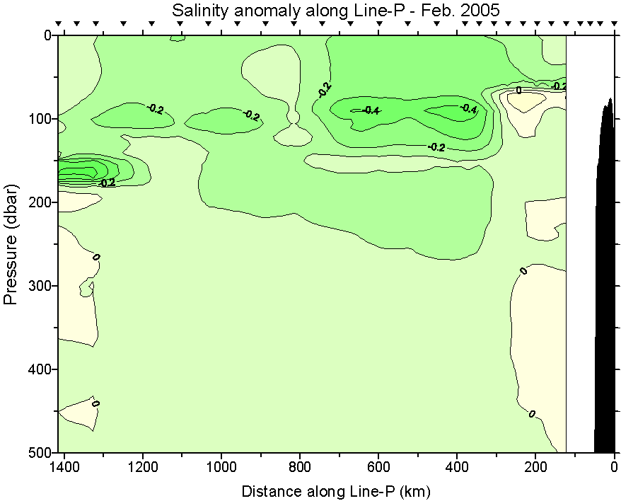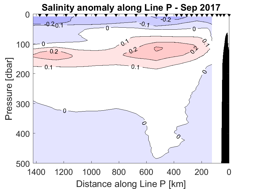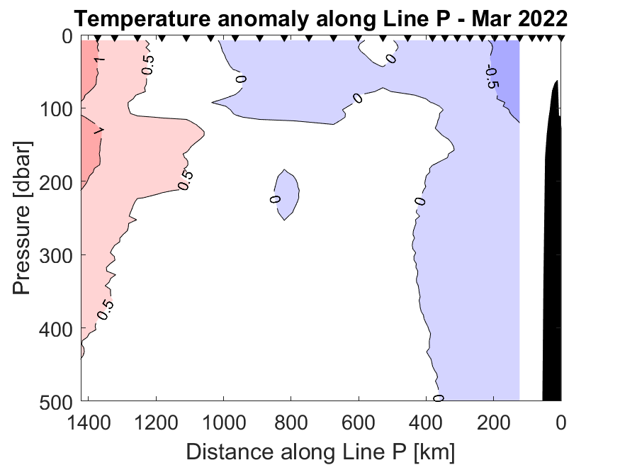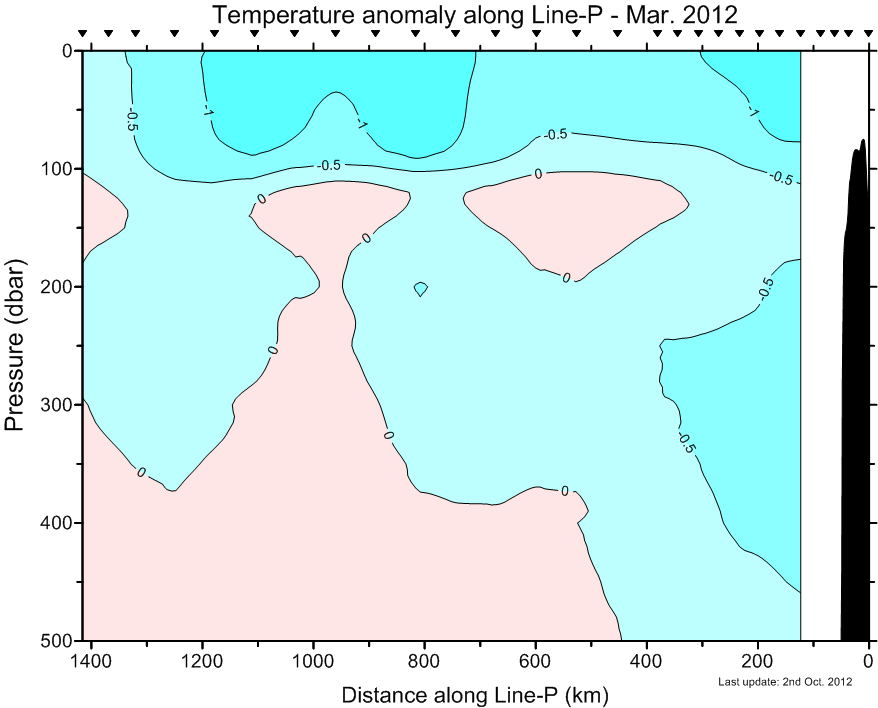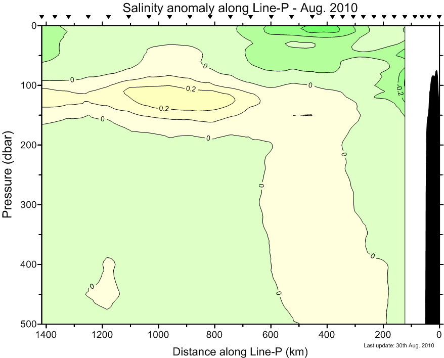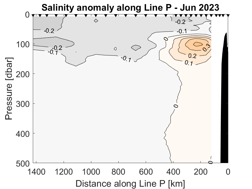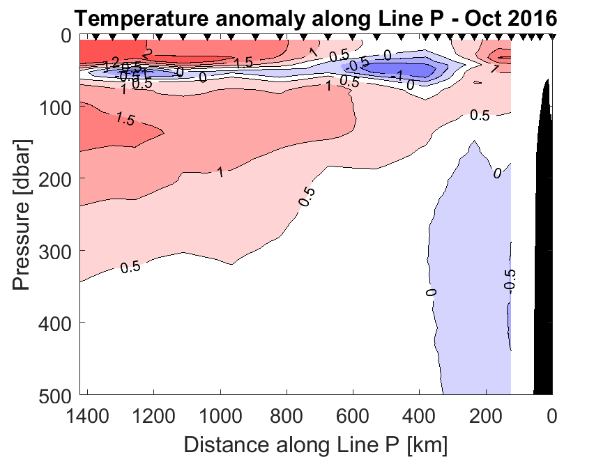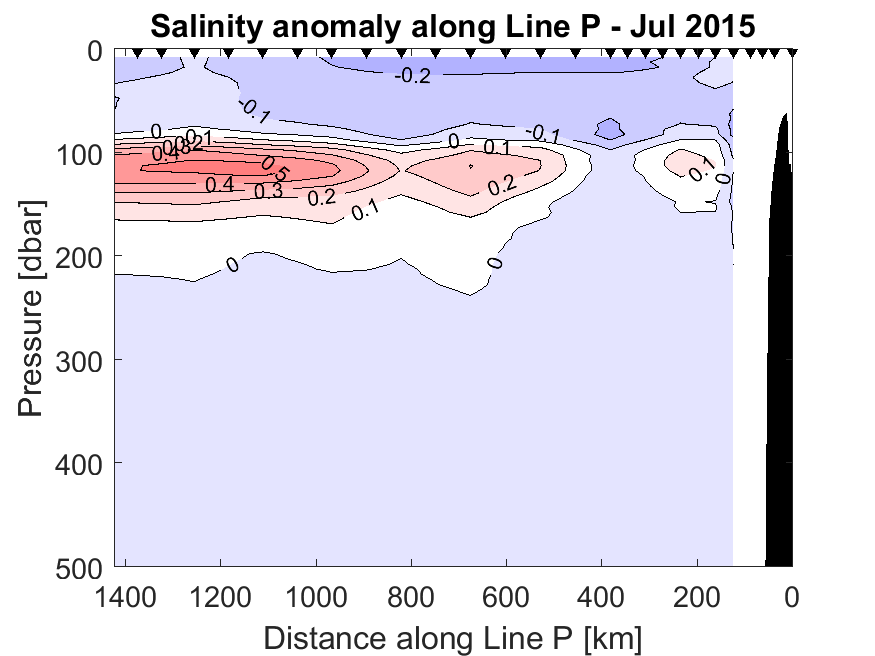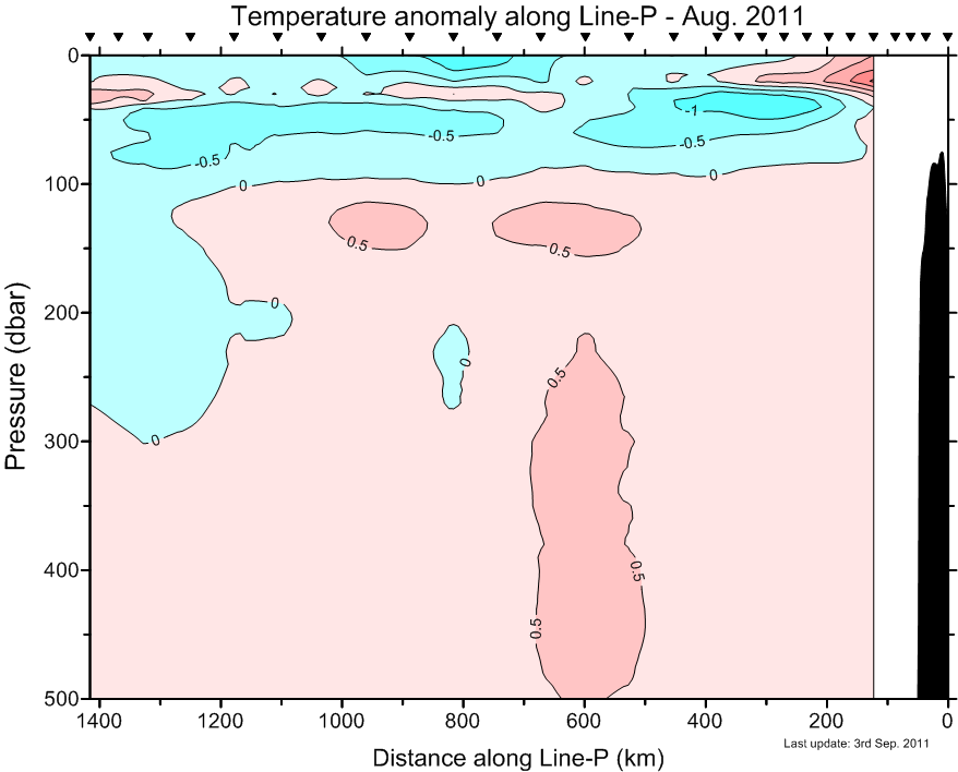 Pour le mois et l'année en cours, les sections sont calculées en utilisant les données disponibles à ce jour. Ces sections sont susceptibles d'être modifiées. Les versions définitives seront publiées lorsque toutes les données seront disponibles. Les anomalies sont calculées par rapport à la climatologie de la ligne P.