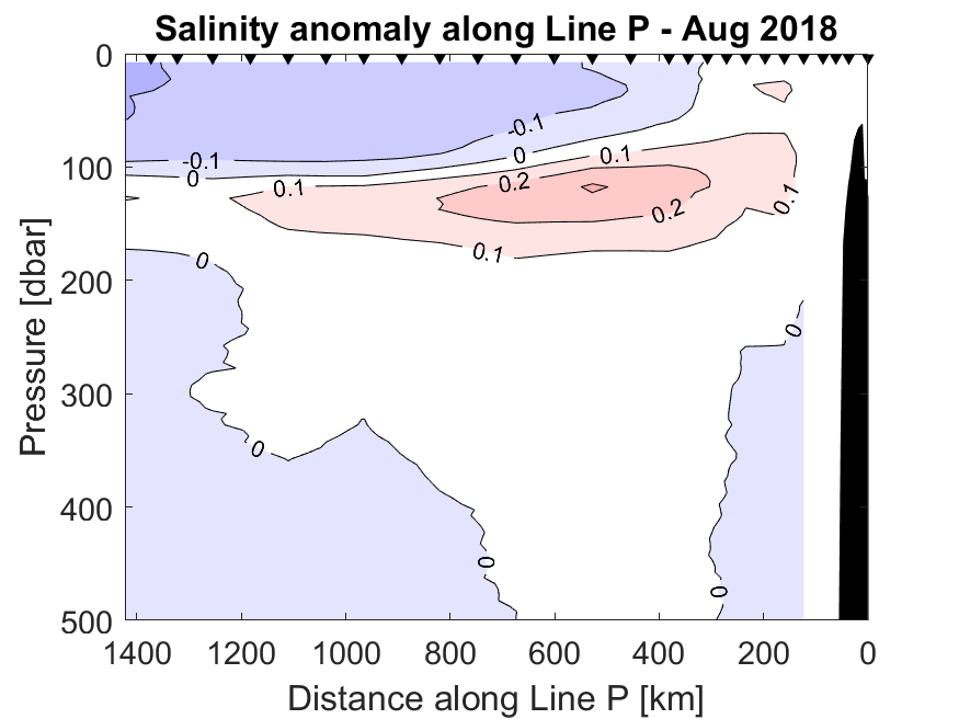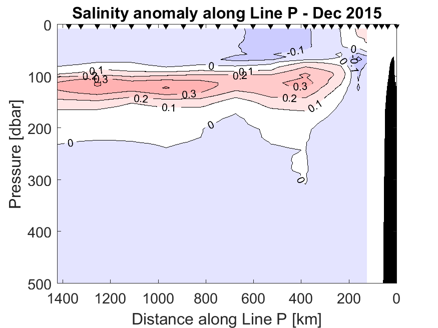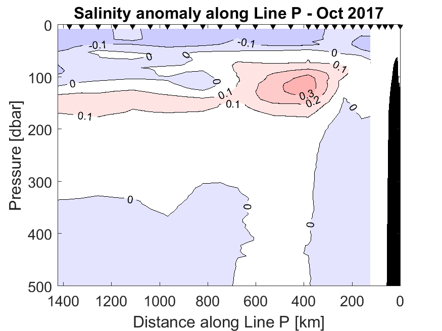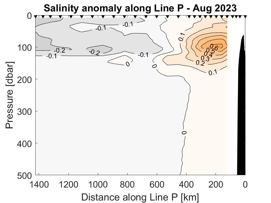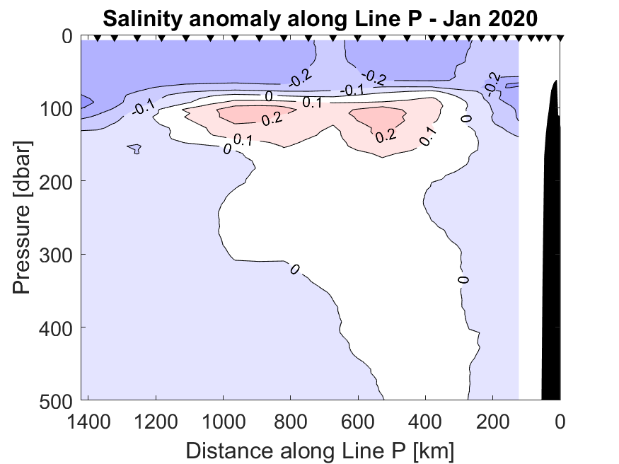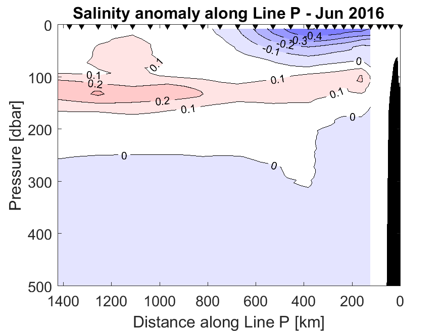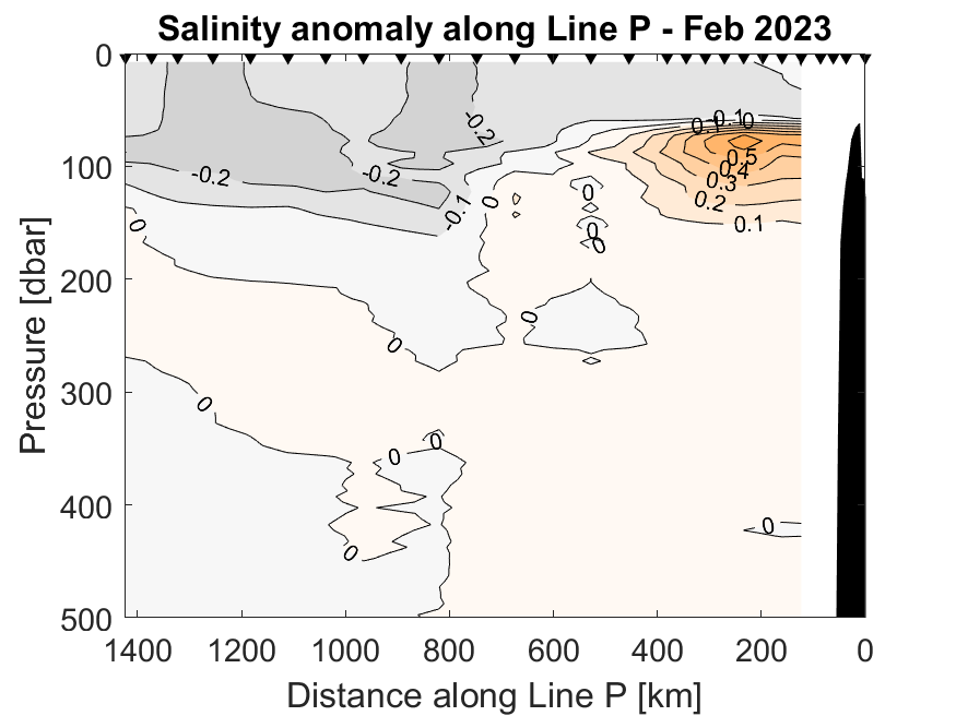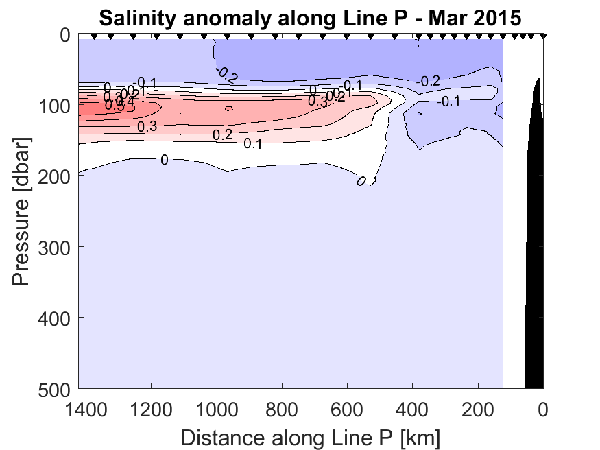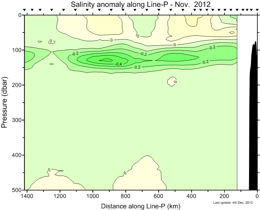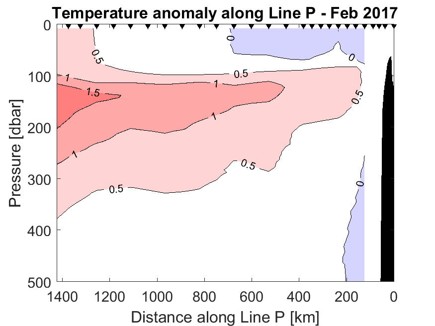 Pour le mois et l'année en cours, les sections sont calculées en utilisant les données disponibles à ce jour. Ces sections sont susceptibles d'être modifiées. Les versions définitives seront publiées lorsque toutes les données seront disponibles. Les anomalies sont calculées par rapport à la climatologie de la ligne P.