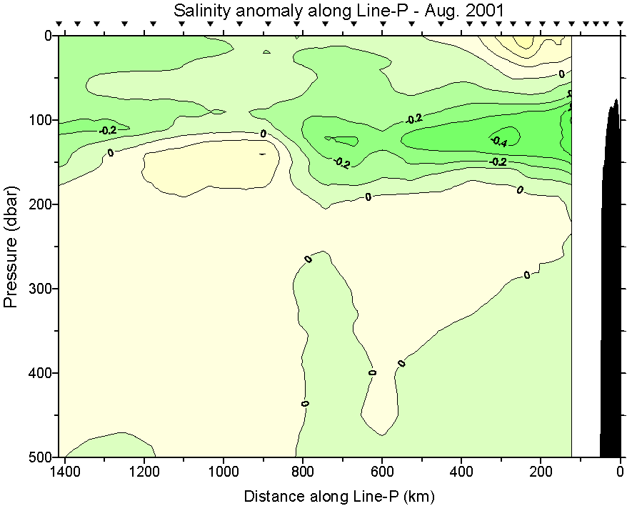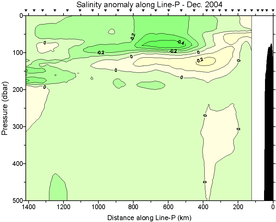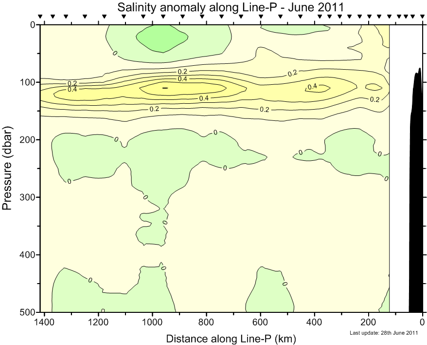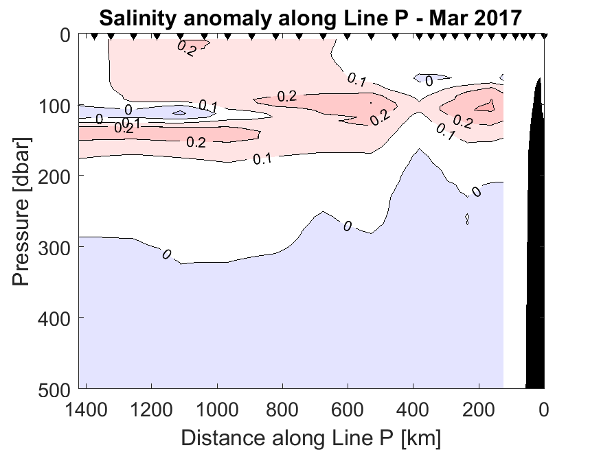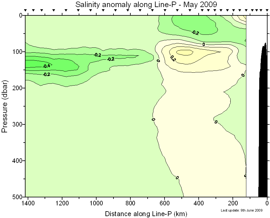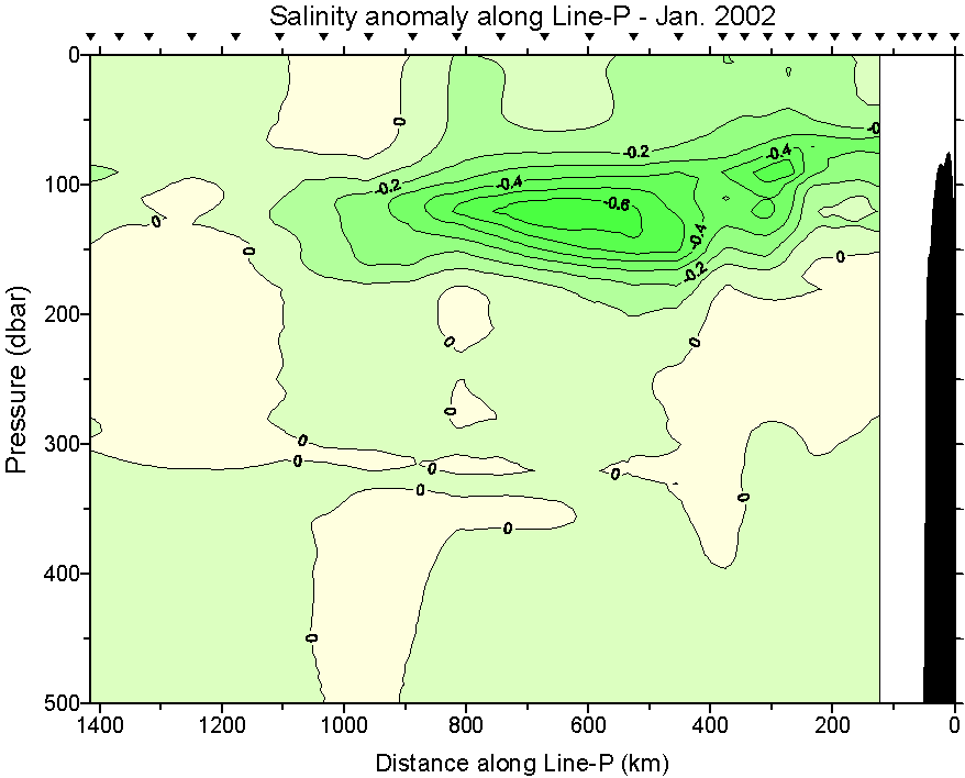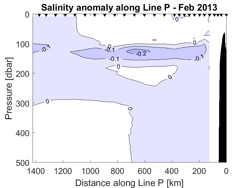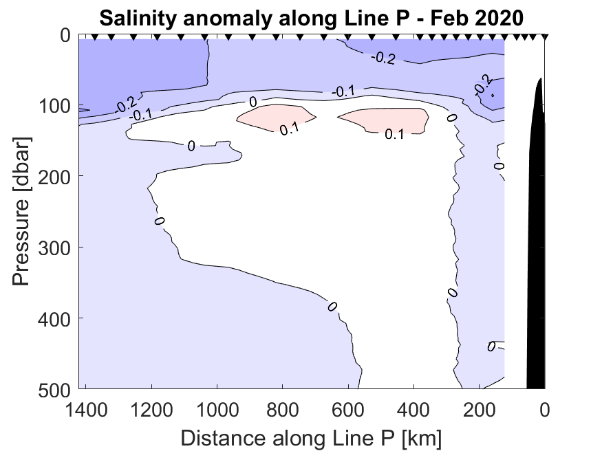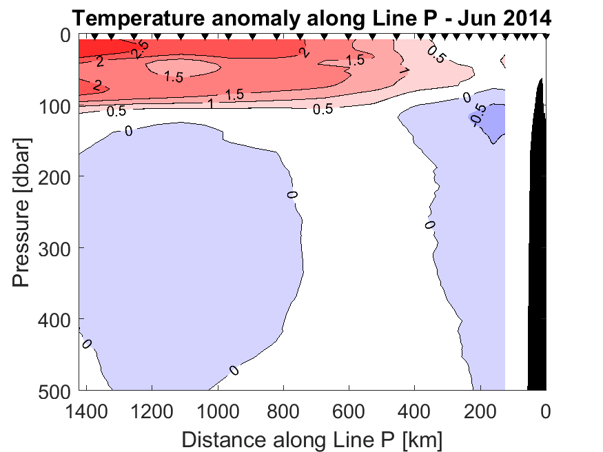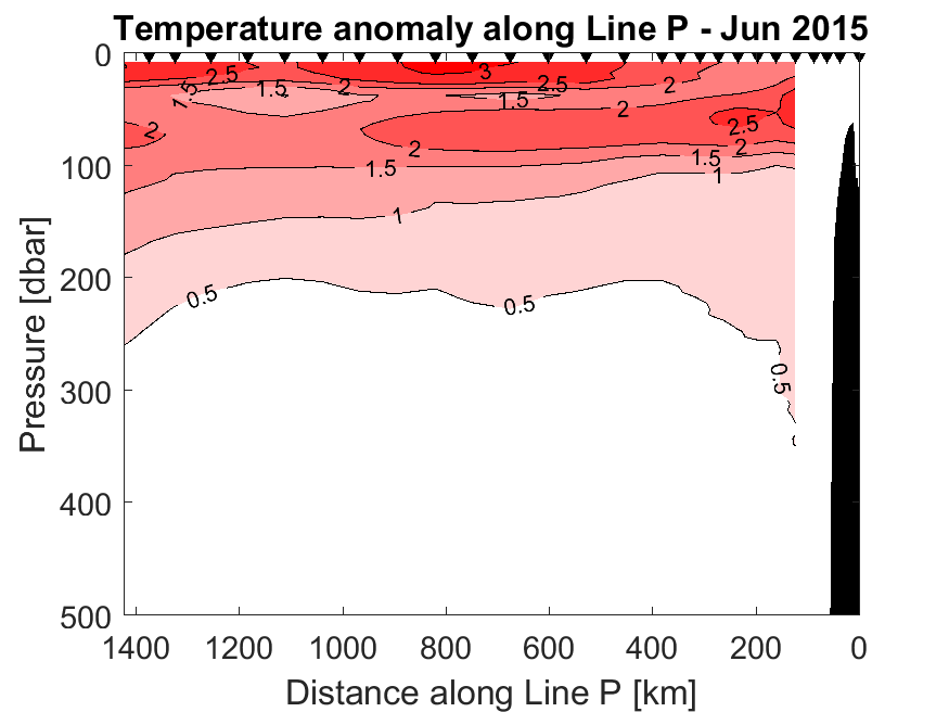 Pour le mois et l'année en cours, les sections sont calculées en utilisant les données disponibles à ce jour. Ces sections sont susceptibles d'être modifiées. Les versions définitives seront publiées lorsque toutes les données seront disponibles. Les anomalies sont calculées par rapport à la climatologie de la ligne P.