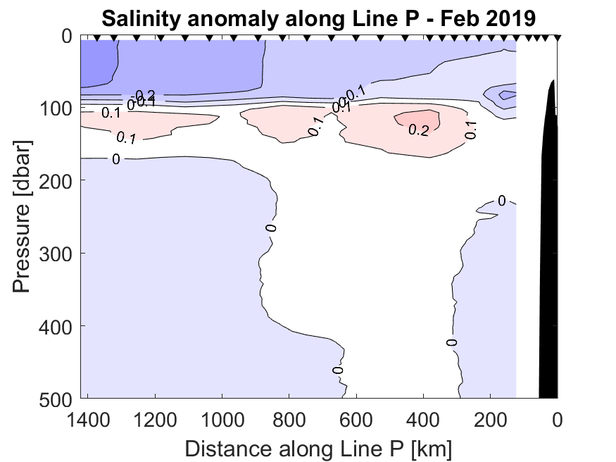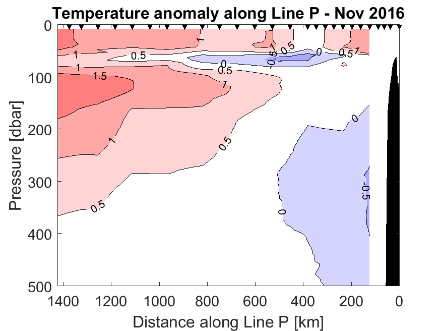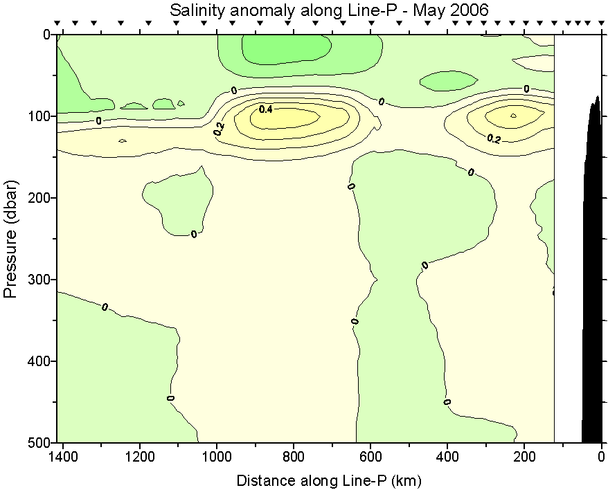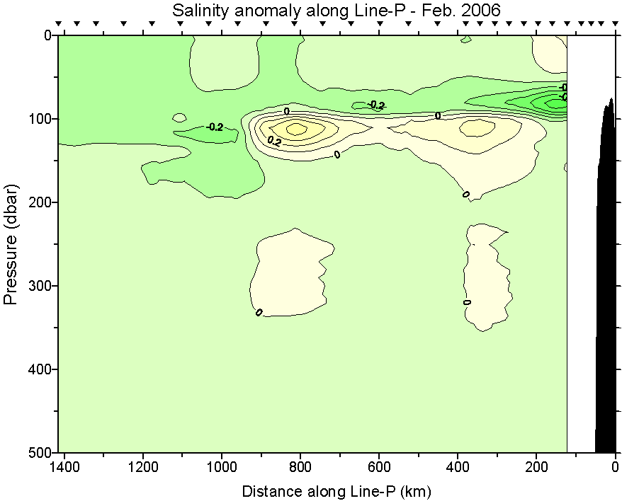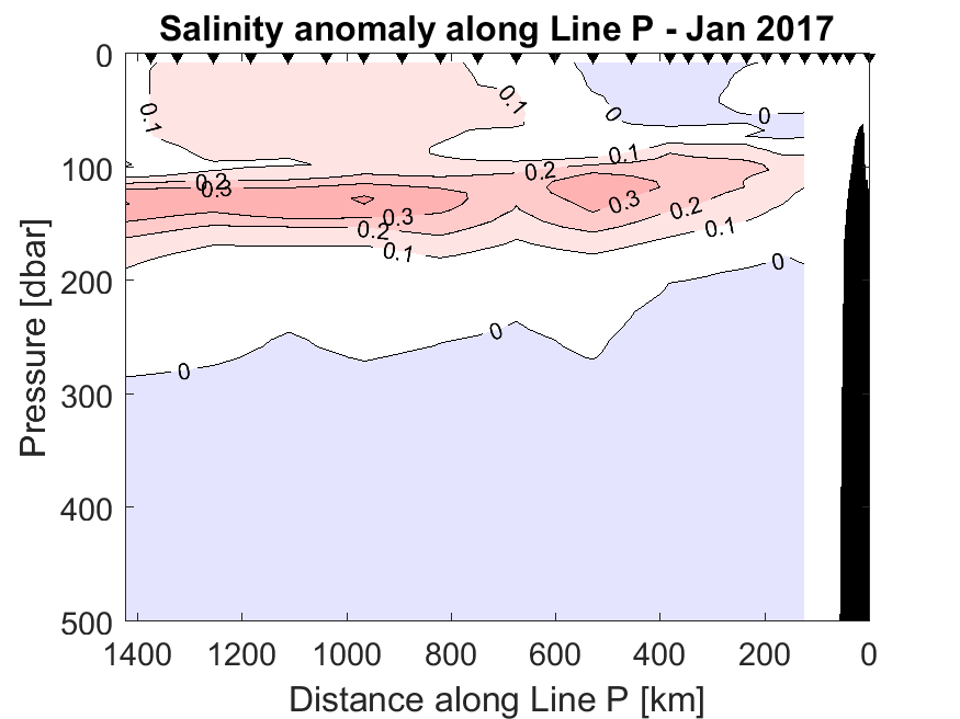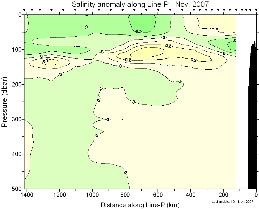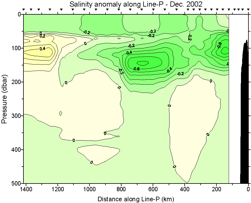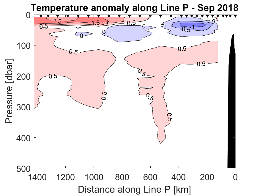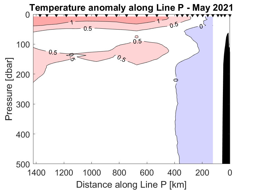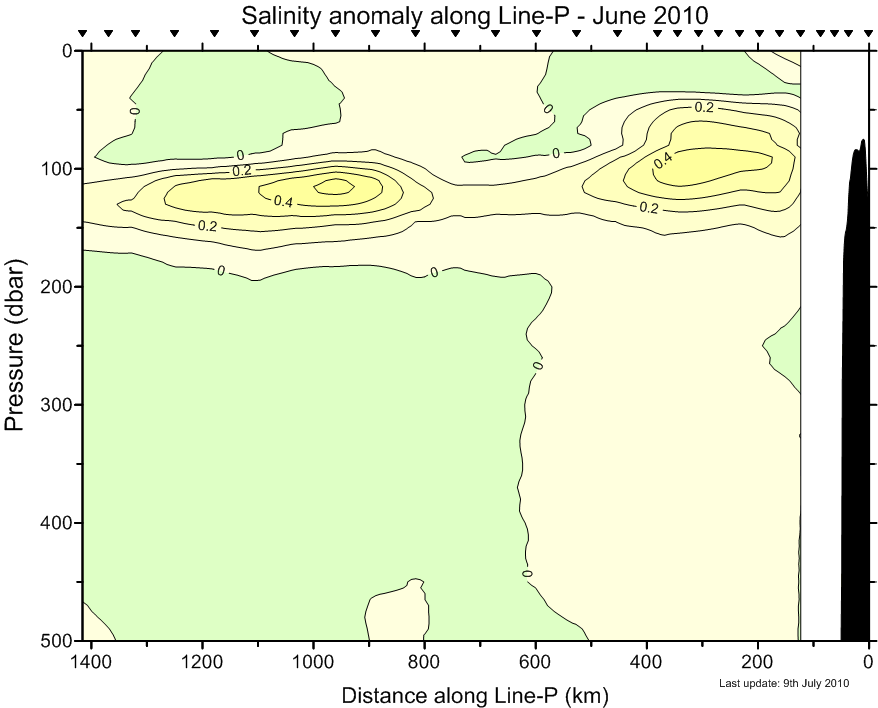 Pour le mois et l'année en cours, les sections sont calculées en utilisant les données disponibles à ce jour. Ces sections sont susceptibles d'être modifiées. Les versions définitives seront publiées lorsque toutes les données seront disponibles. Les anomalies sont calculées par rapport à la climatologie de la ligne P.
