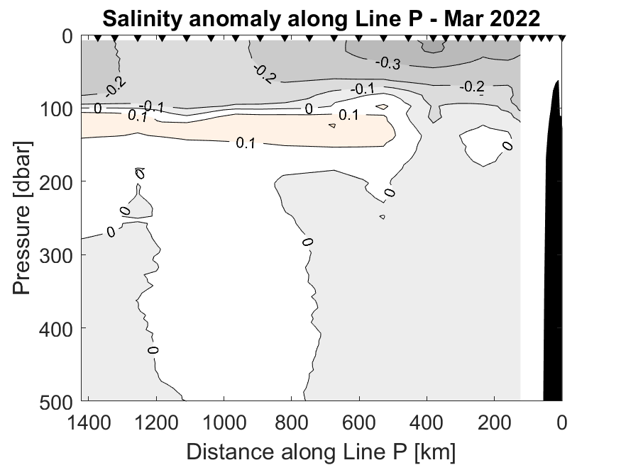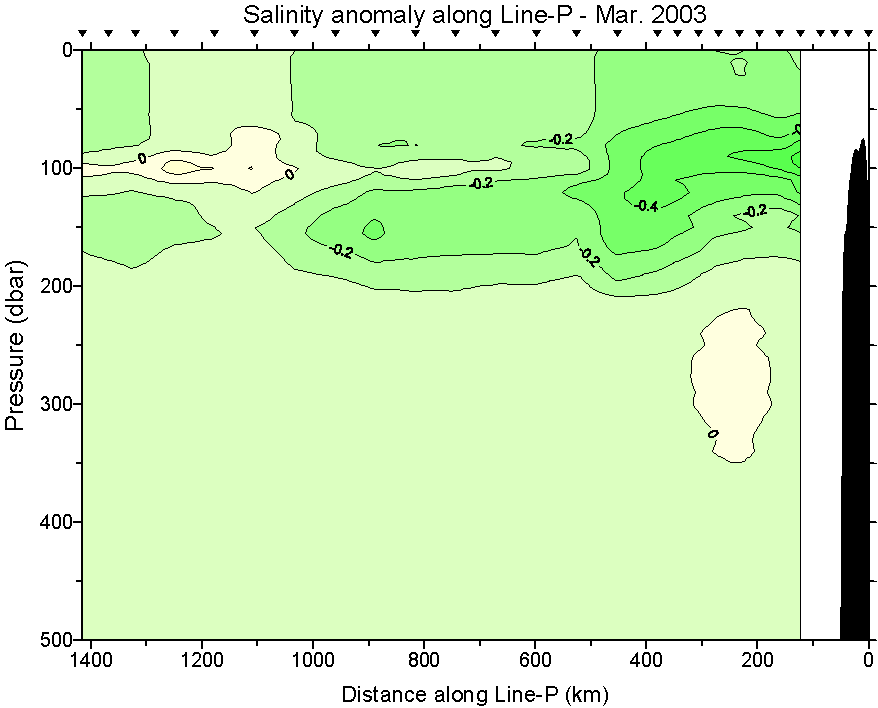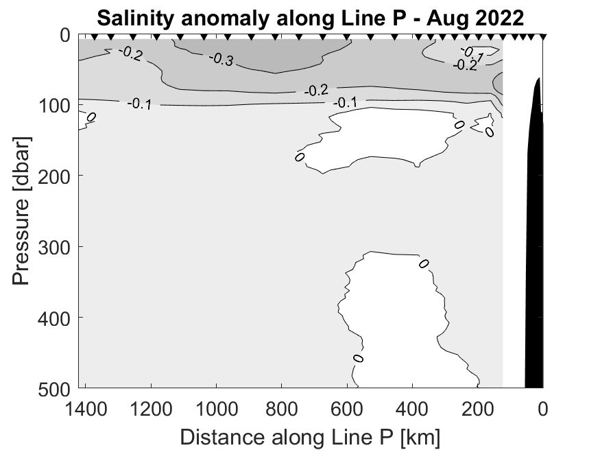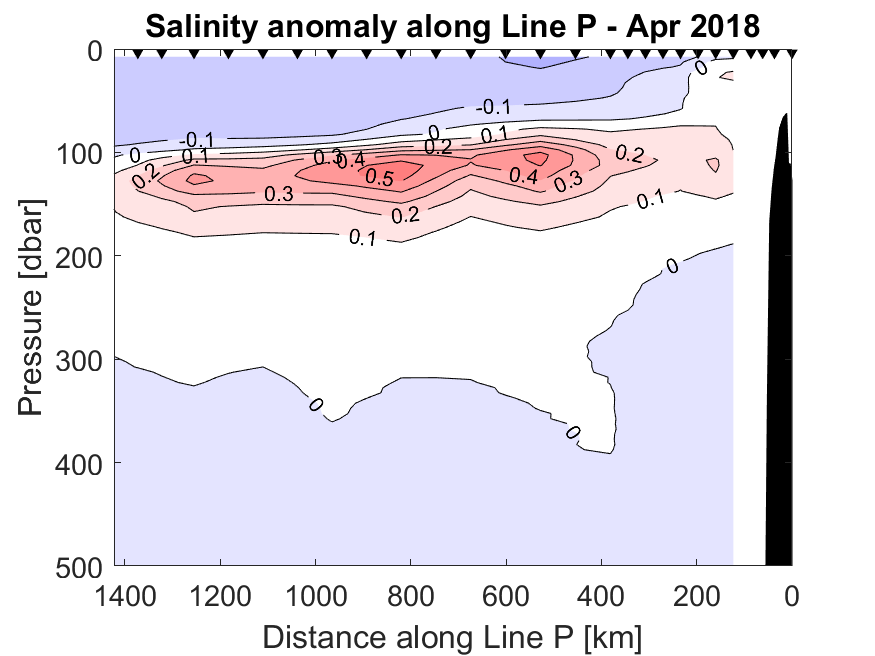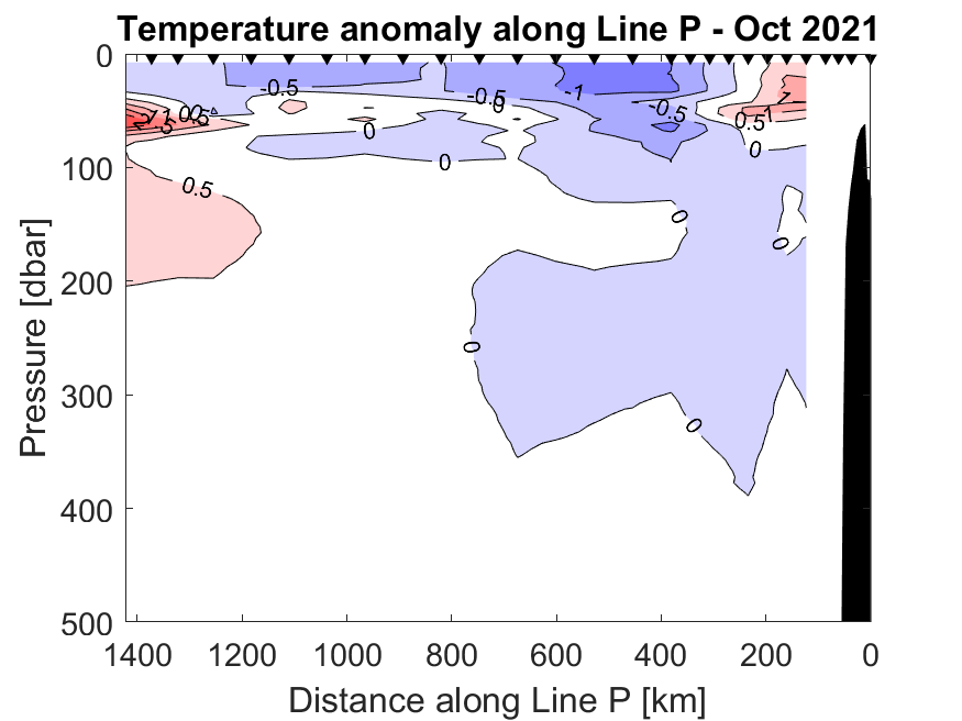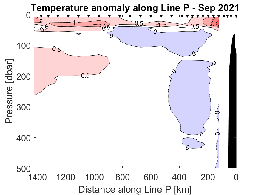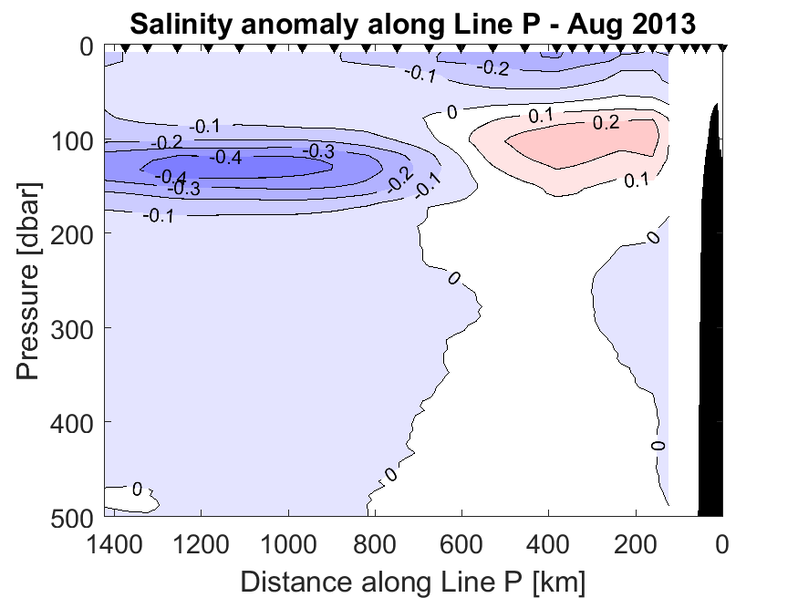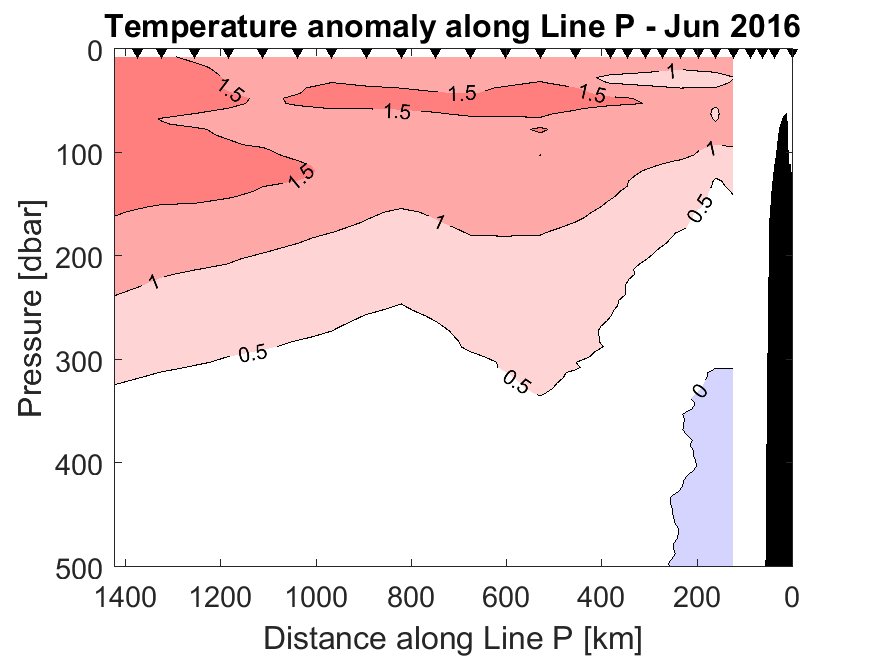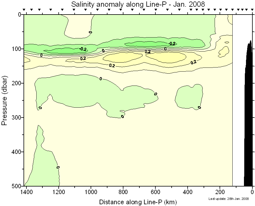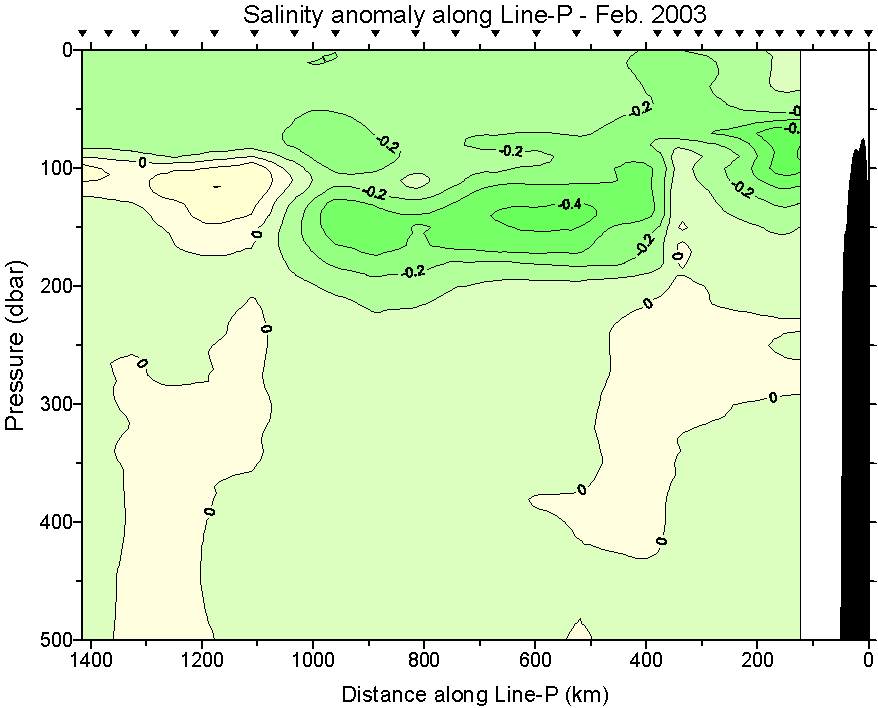 Pour le mois et l'année en cours, les sections sont calculées en utilisant les données disponibles à ce jour. Ces sections sont susceptibles d'être modifiées. Les versions définitives seront publiées lorsque toutes les données seront disponibles. Les anomalies sont calculées par rapport à la climatologie de la ligne P.