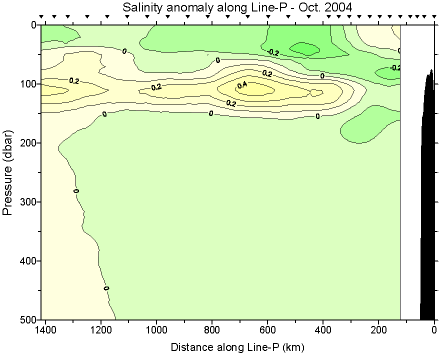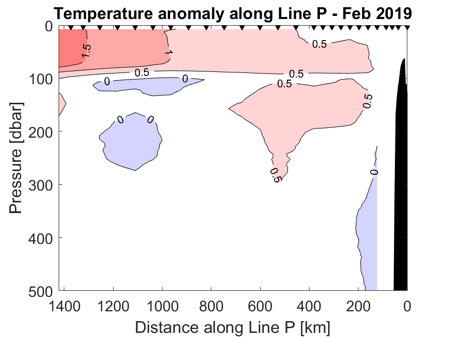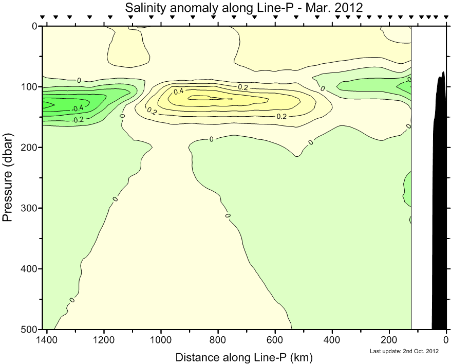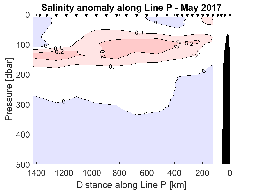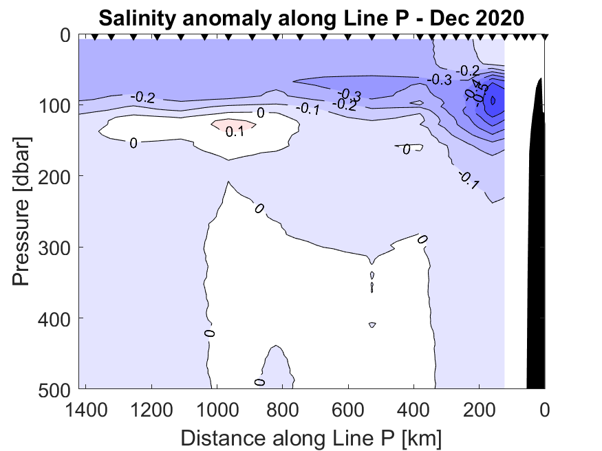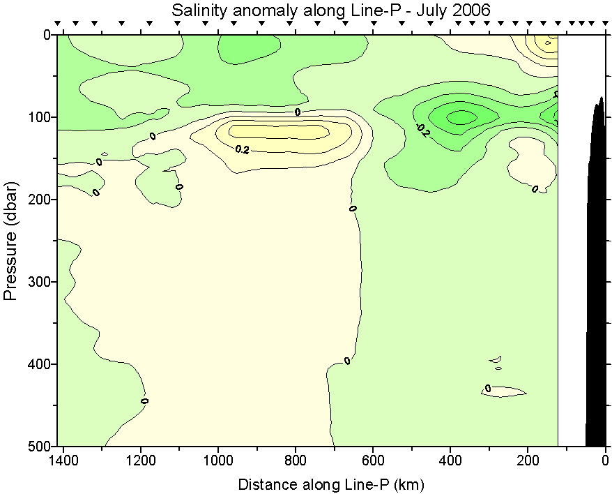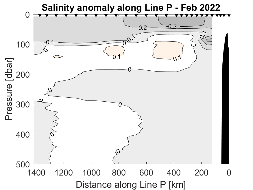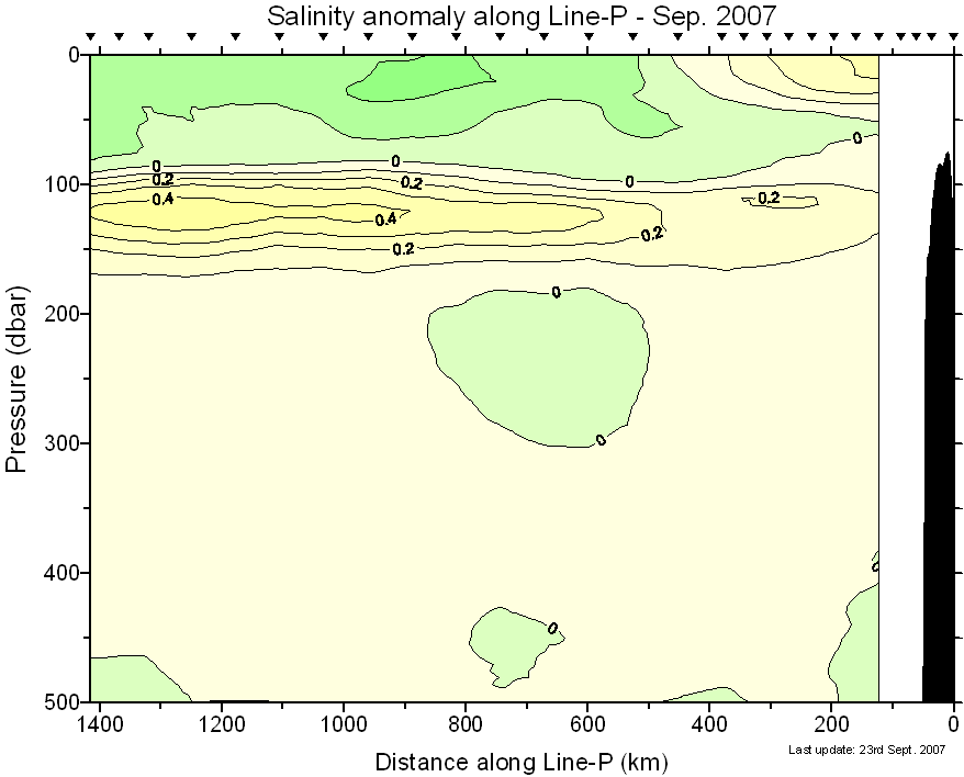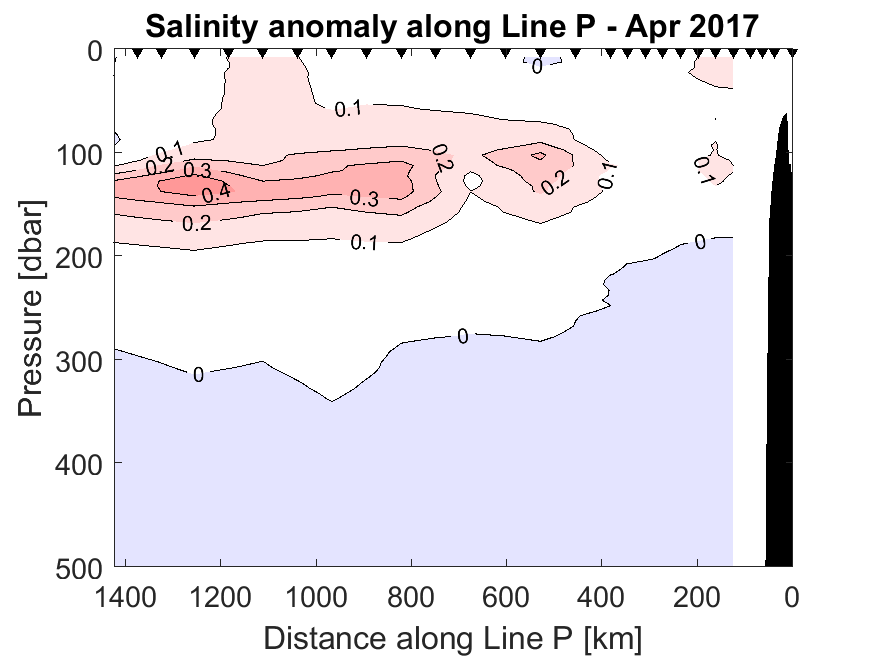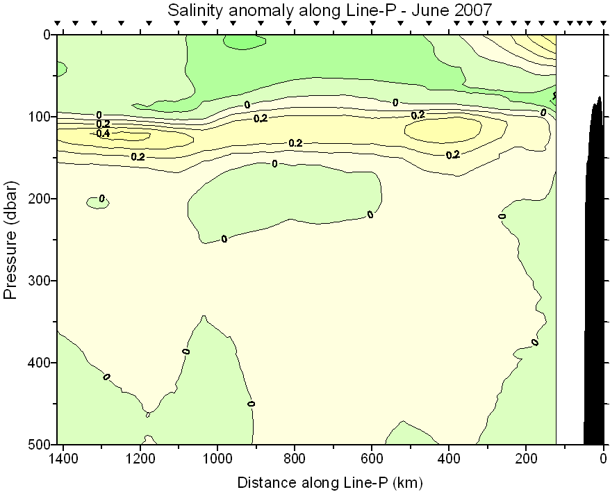 Pour le mois et l'année en cours, les sections sont calculées en utilisant les données disponibles à ce jour. Ces sections sont susceptibles d'être modifiées. Les versions définitives seront publiées lorsque toutes les données seront disponibles. Les anomalies sont calculées par rapport à la climatologie de la ligne P.