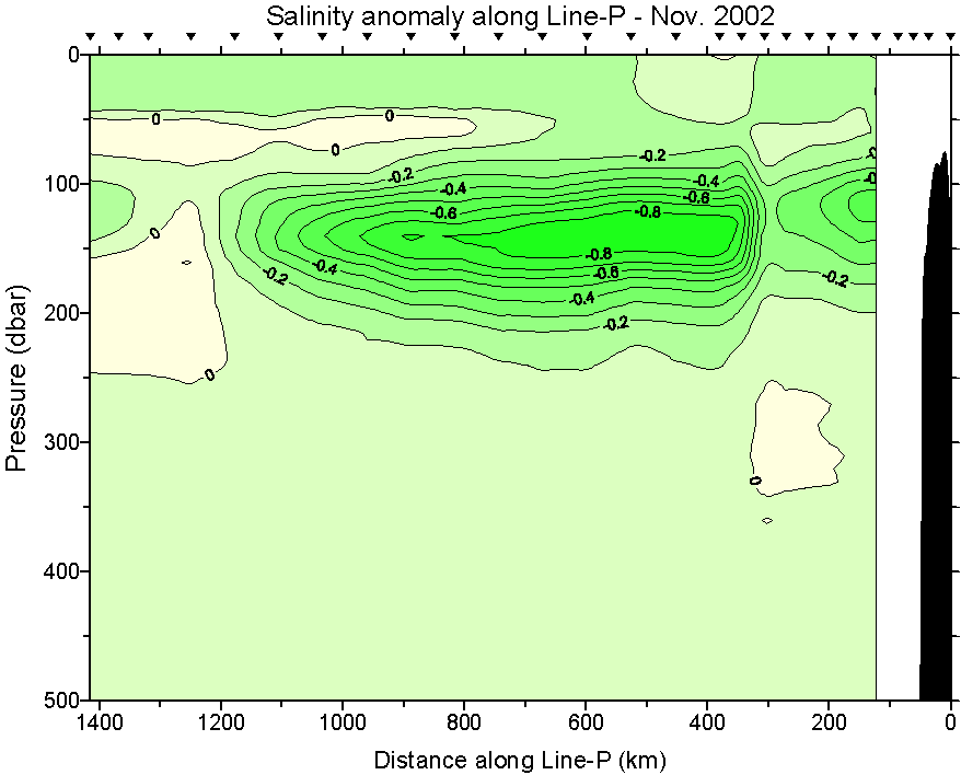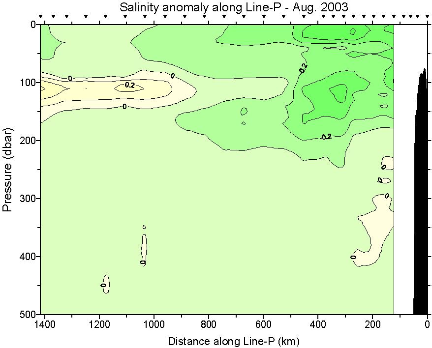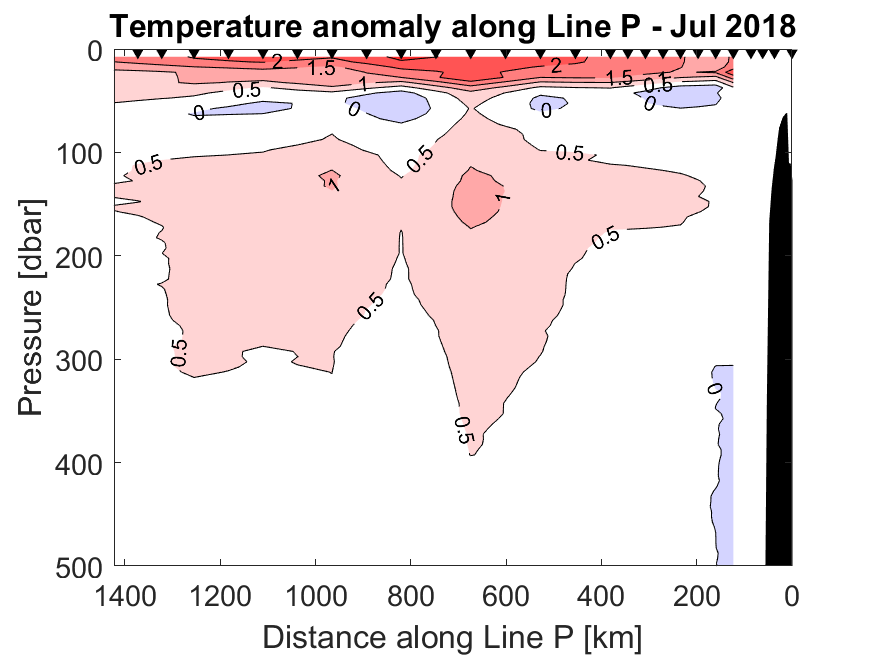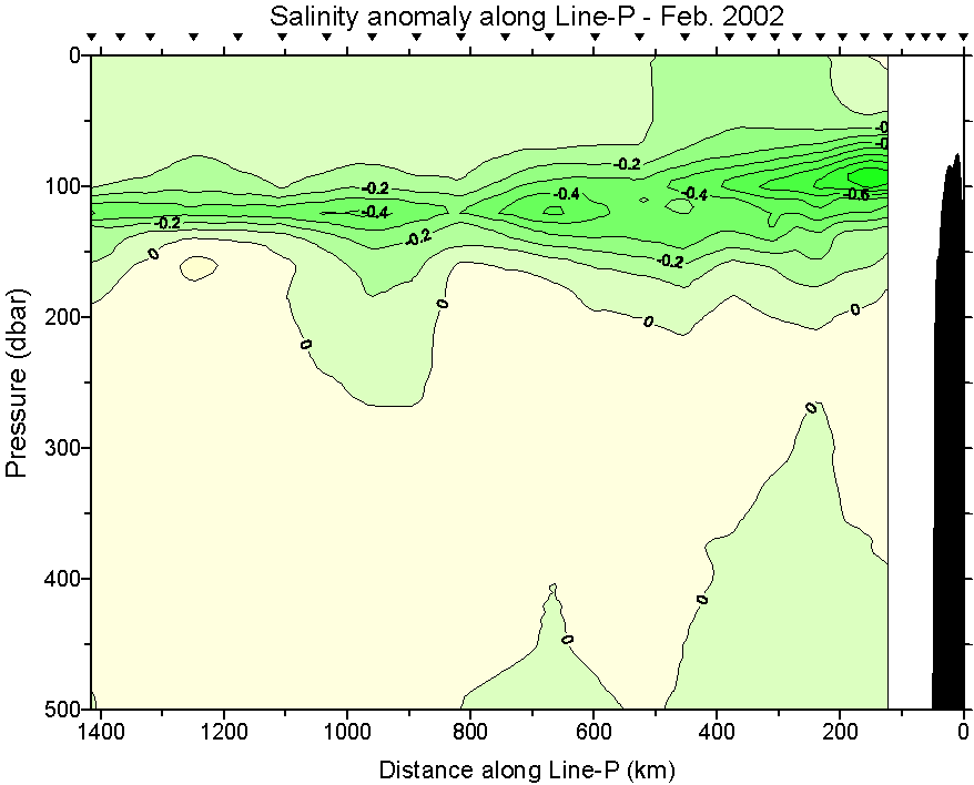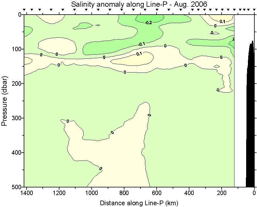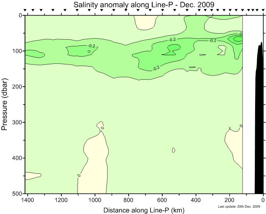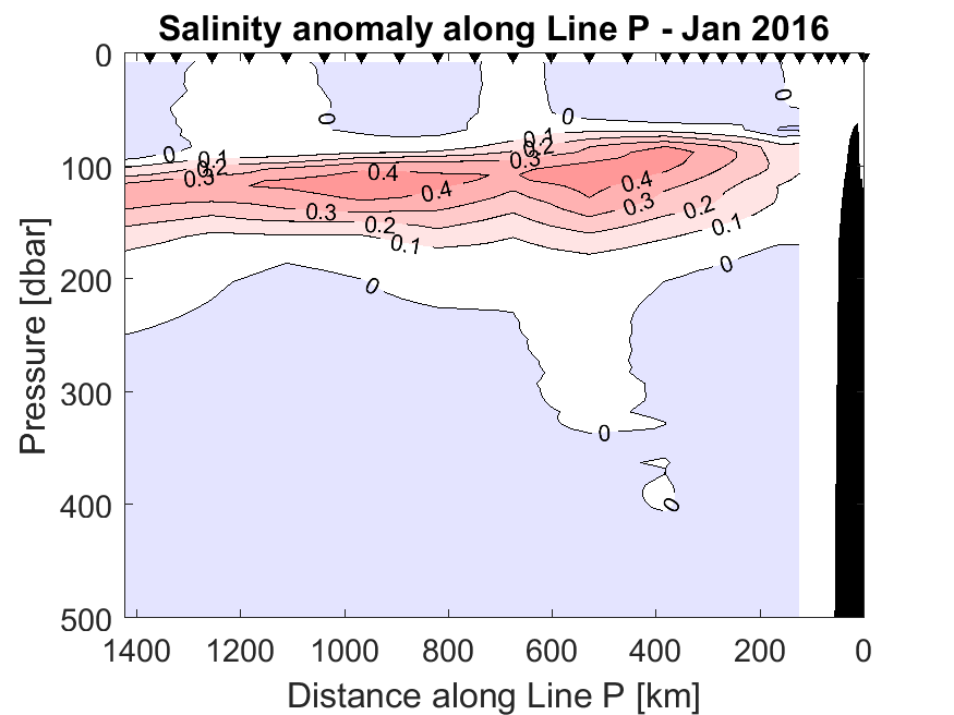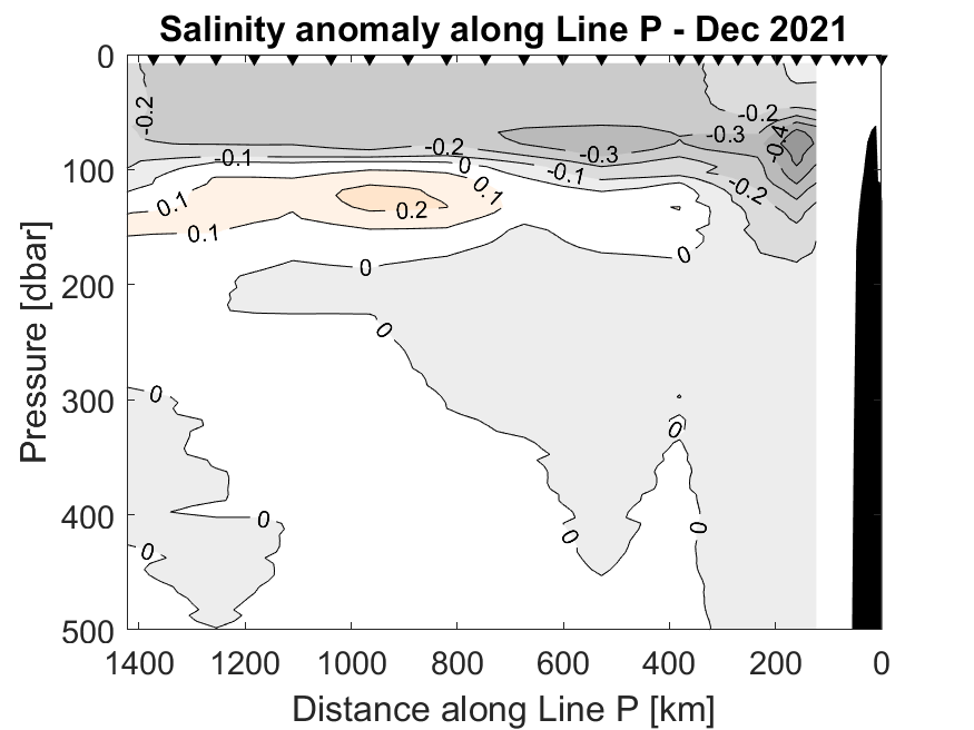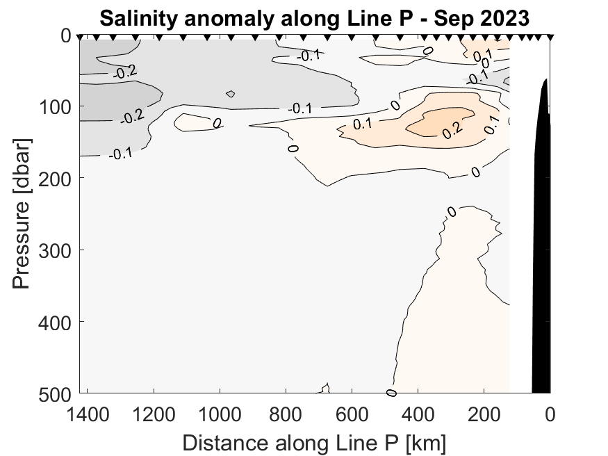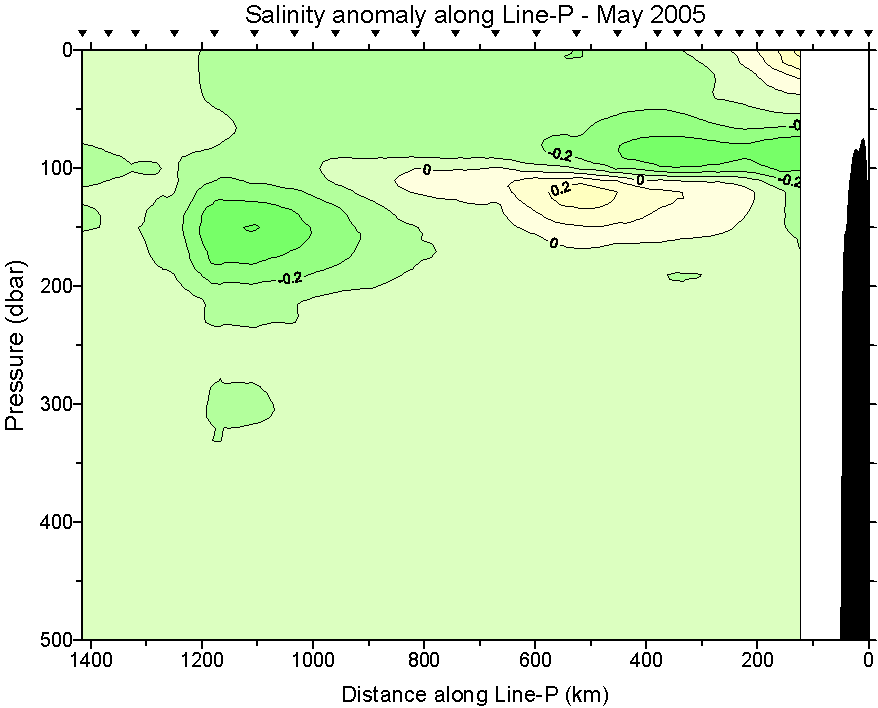Pour le mois et l'année en cours, les sections sont calculées en utilisant les données disponibles à ce jour. Ces sections sont susceptibles d'être modifiées. Les versions définitives seront publiées lorsque toutes les données seront disponibles. Les anomalies sont calculées par rapport à la climatologie de la ligne P.