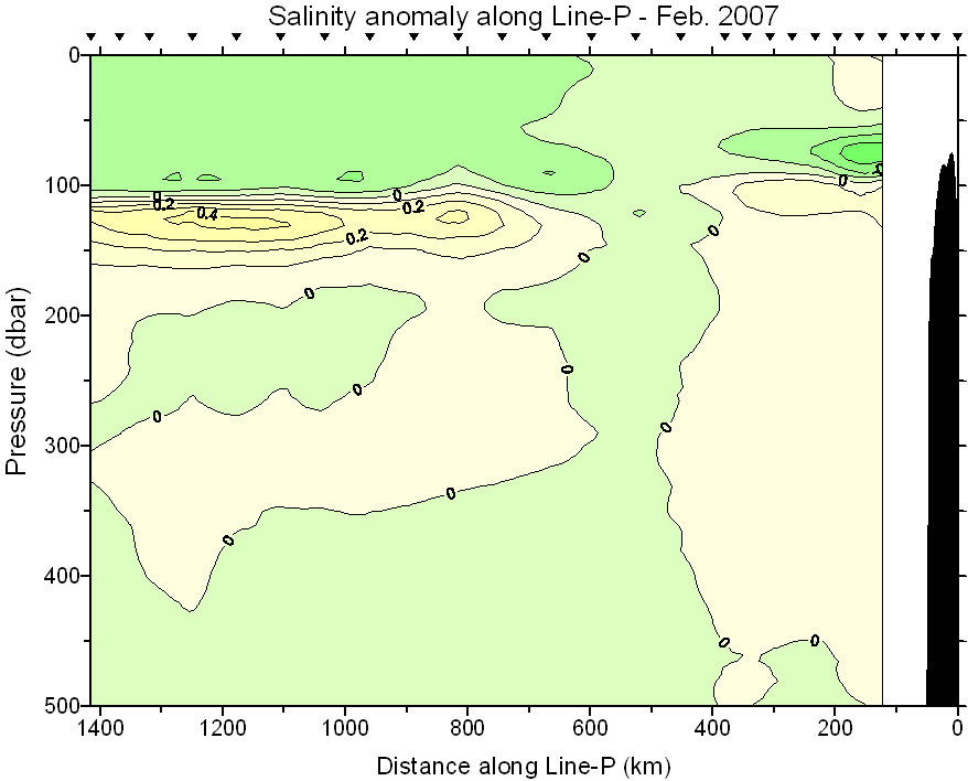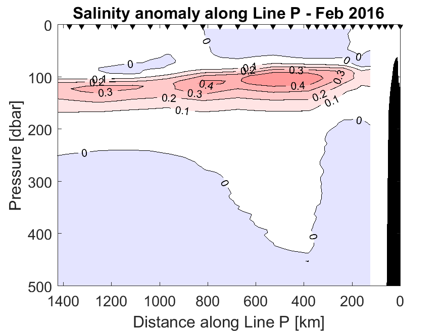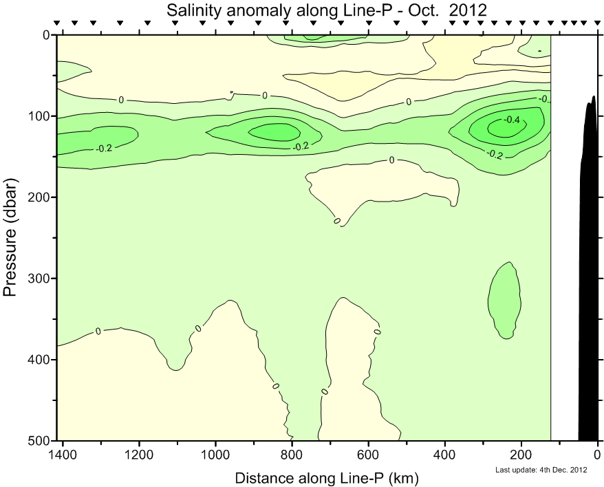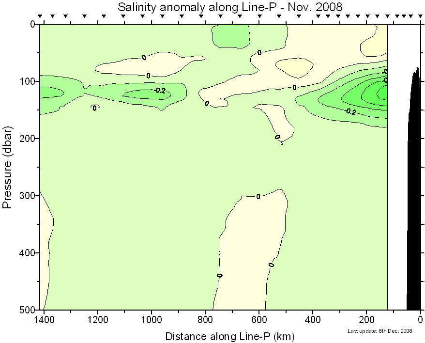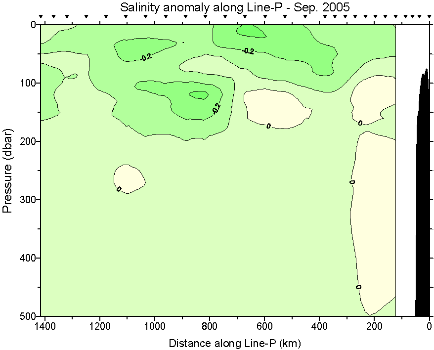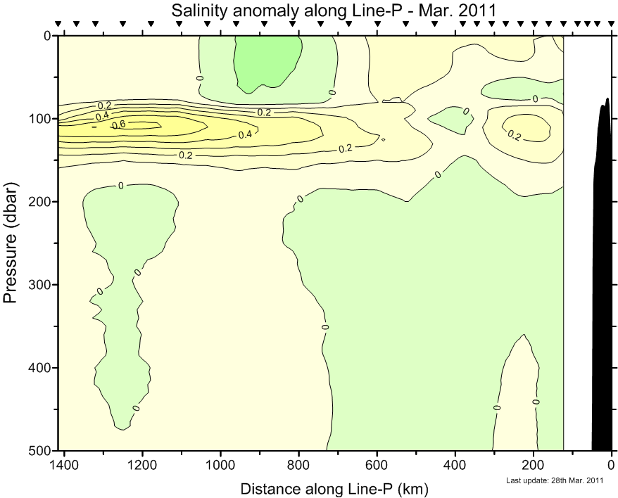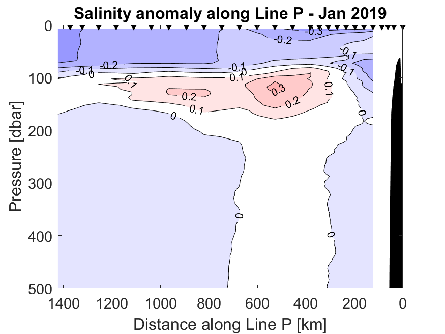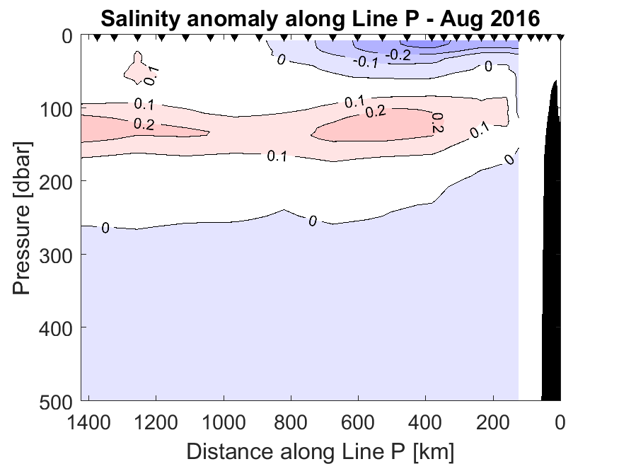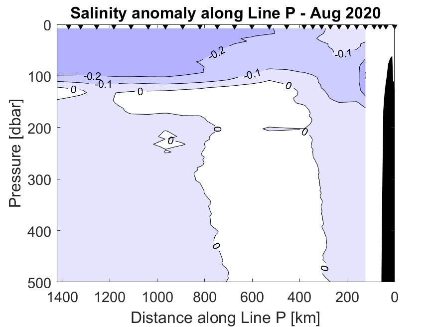 Pour le mois et l'année en cours, les sections sont calculées en utilisant les données disponibles à ce jour. Ces sections sont susceptibles d'être modifiées. Les versions définitives seront publiées lorsque toutes les données seront disponibles. Les anomalies sont calculées par rapport à la climatologie de la ligne P.