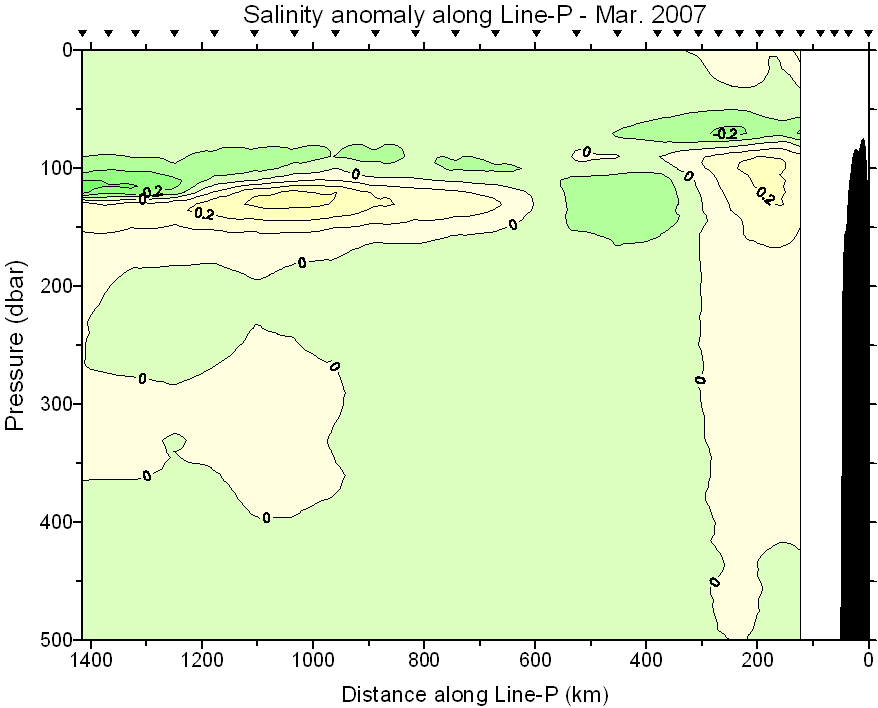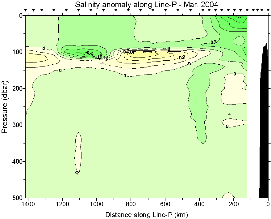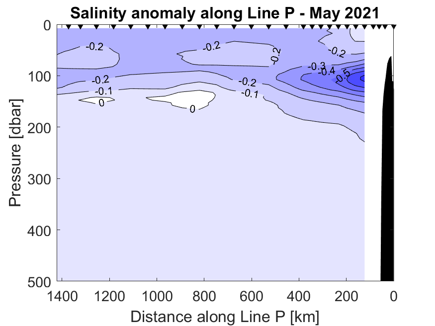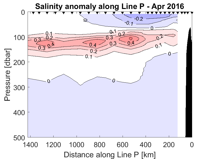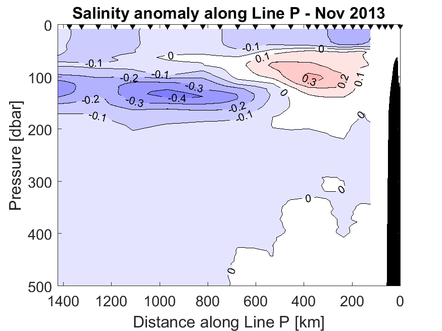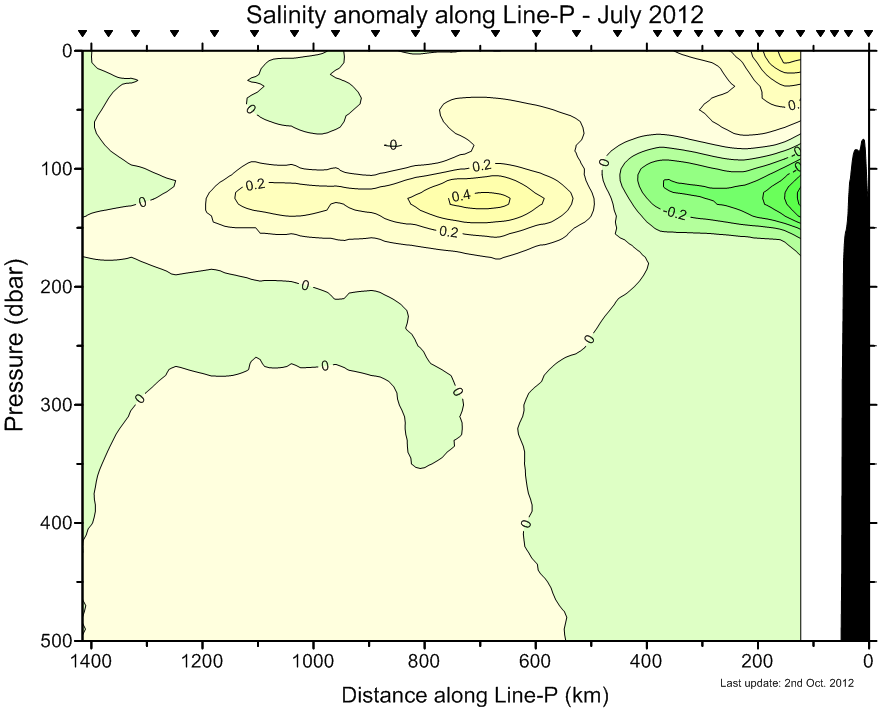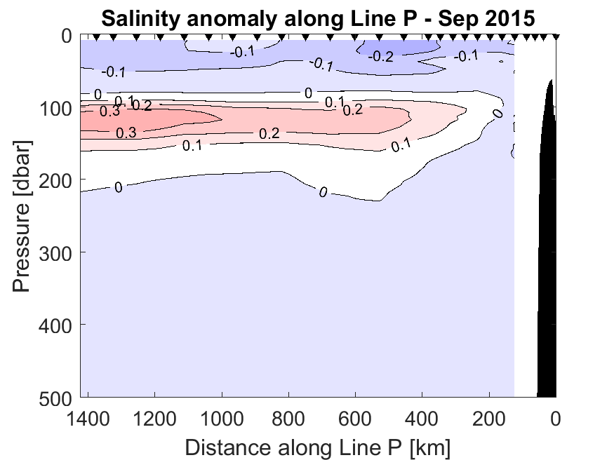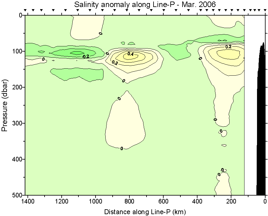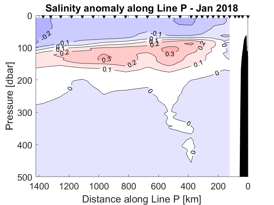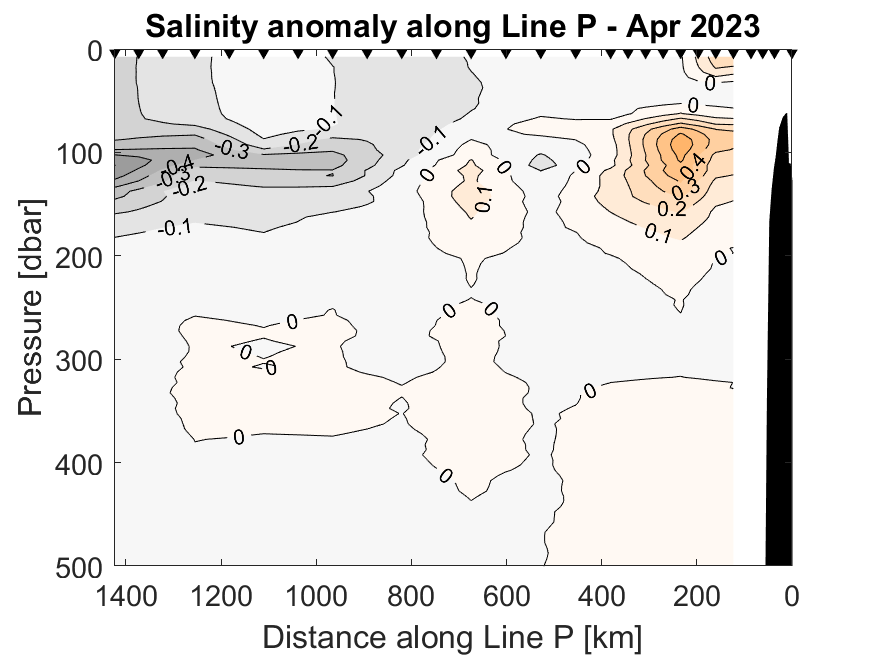 Pour le mois et l'année en cours, les sections sont calculées en utilisant les données disponibles à ce jour. Ces sections sont susceptibles d'être modifiées. Les versions définitives seront publiées lorsque toutes les données seront disponibles. Les anomalies sont calculées par rapport à la climatologie de la ligne P.