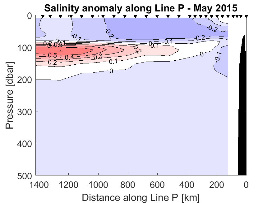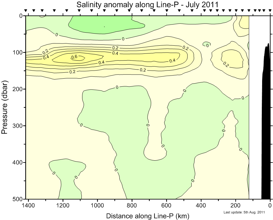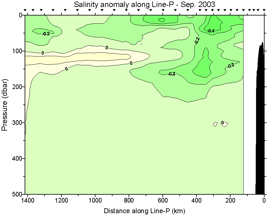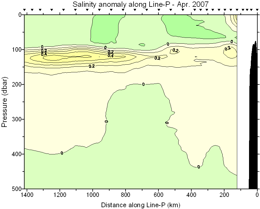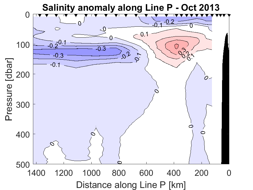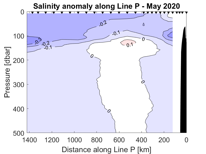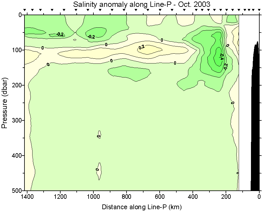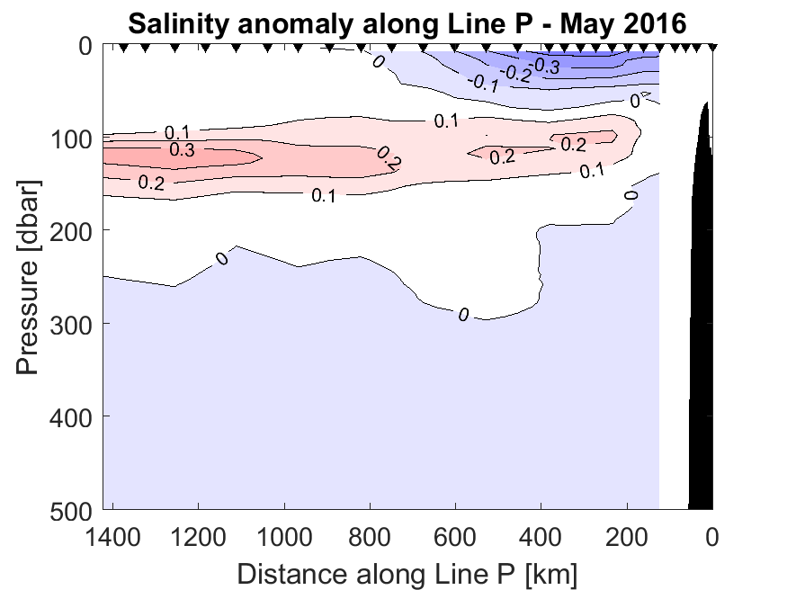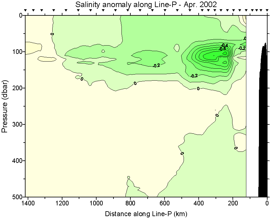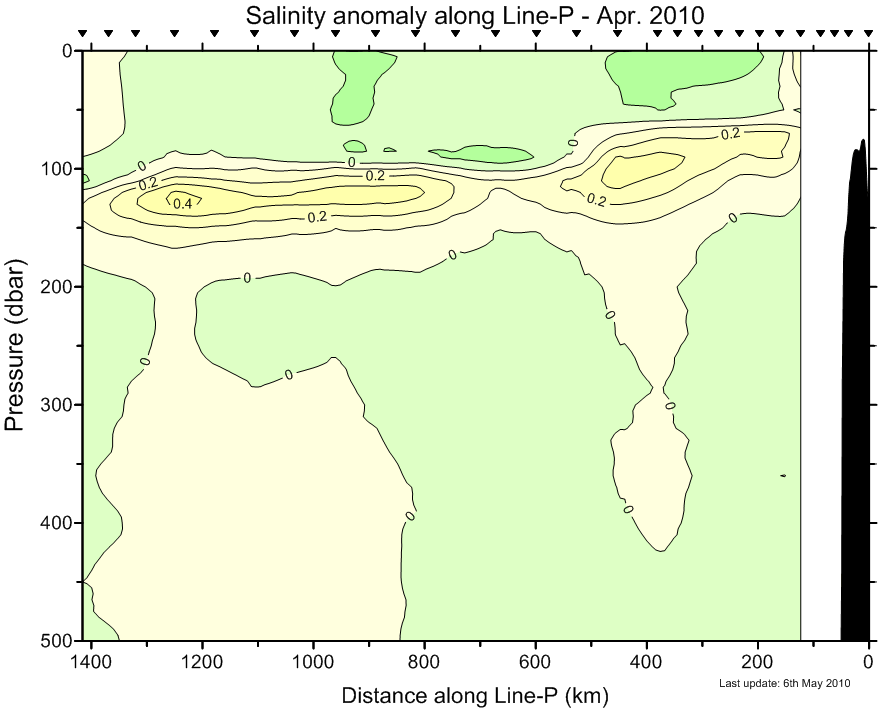 Pour le mois et l'année en cours, les sections sont calculées en utilisant les données disponibles à ce jour. Ces sections sont susceptibles d'être modifiées. Les versions définitives seront publiées lorsque toutes les données seront disponibles. Les anomalies sont calculées par rapport à la climatologie de la ligne P.