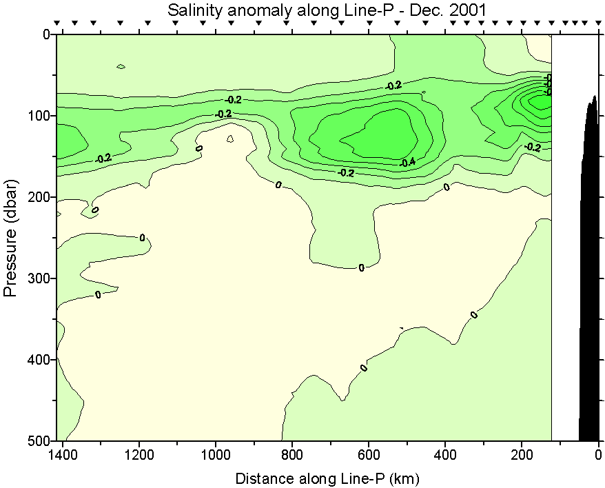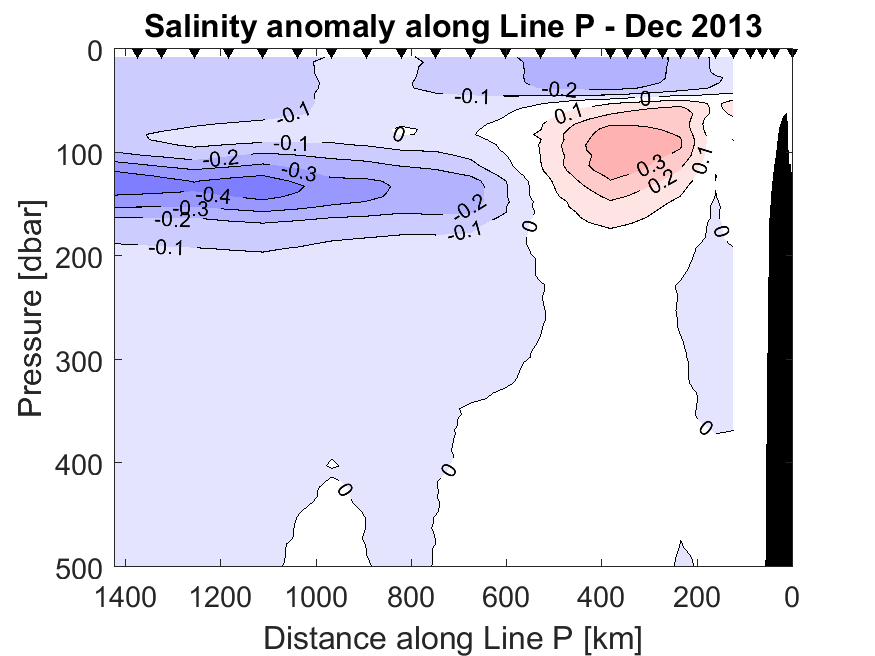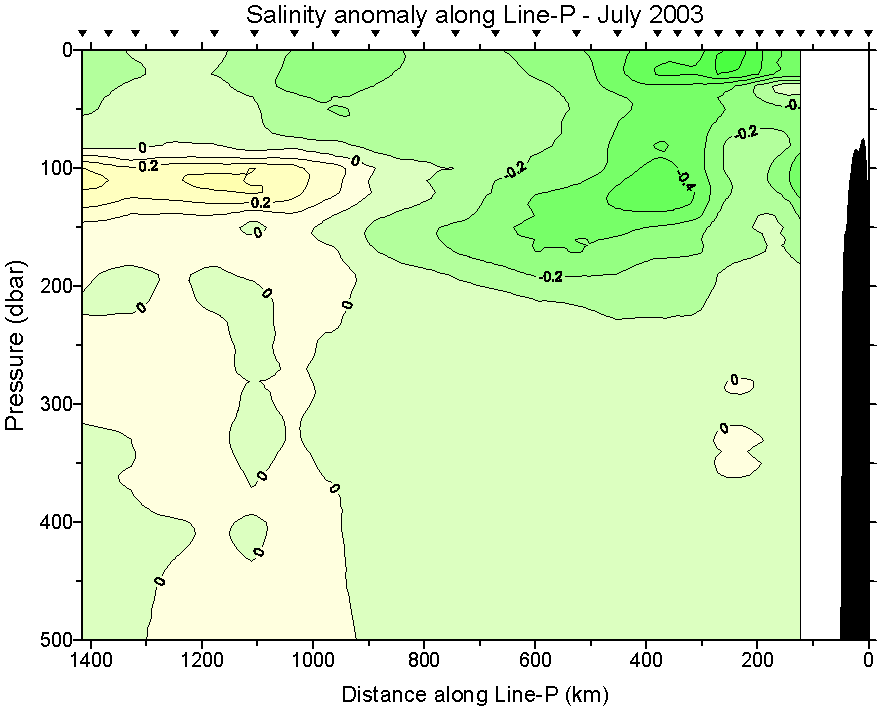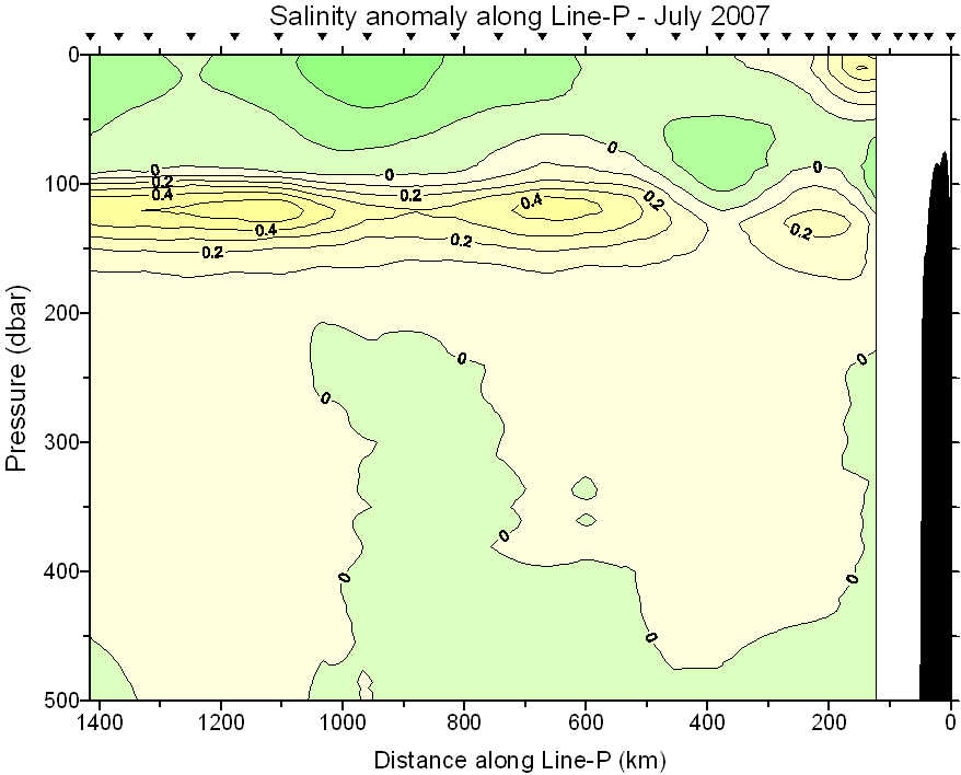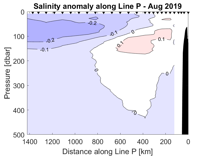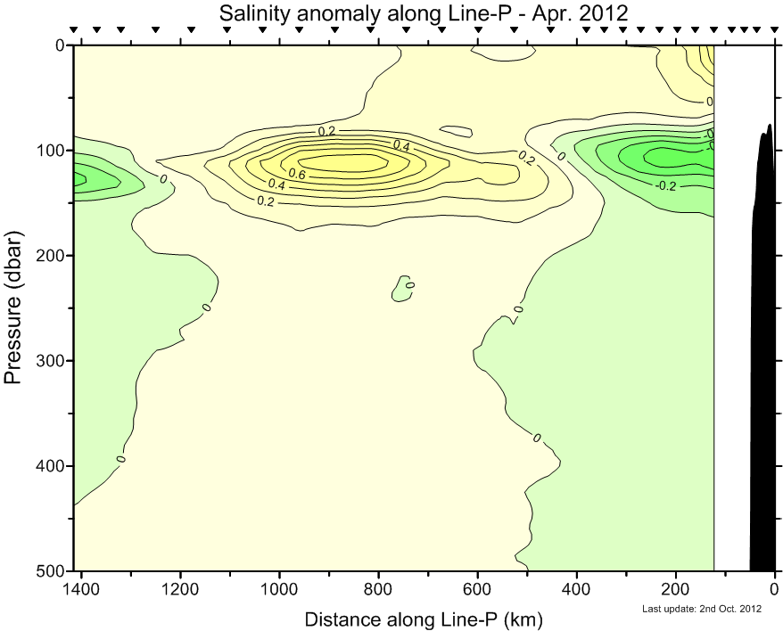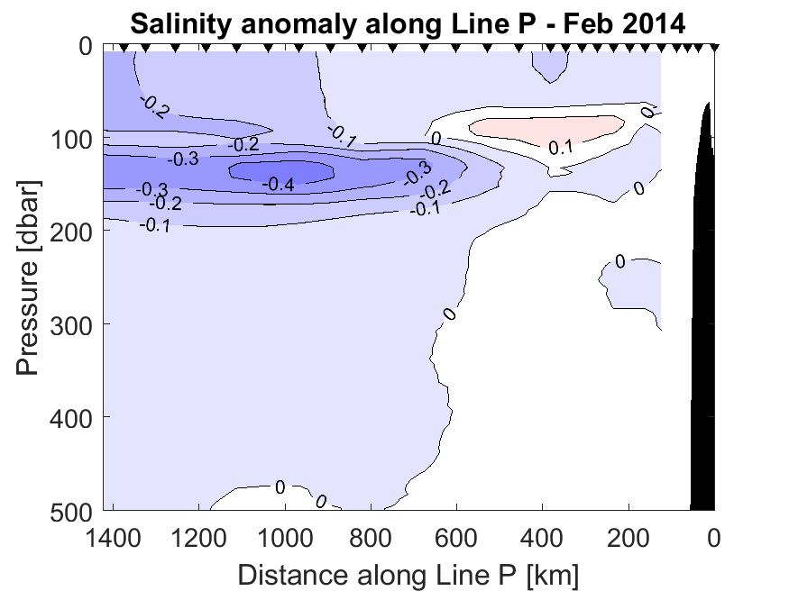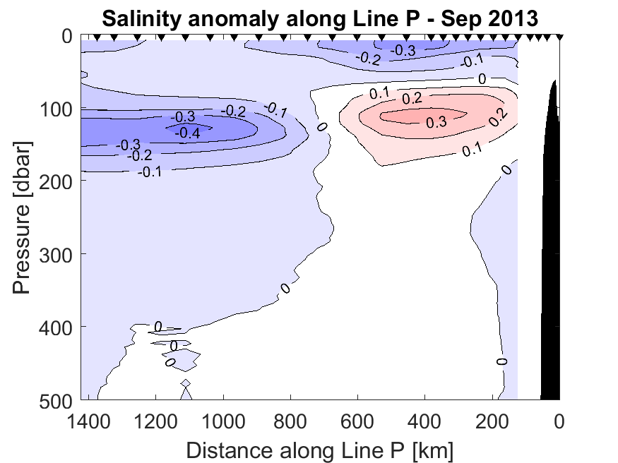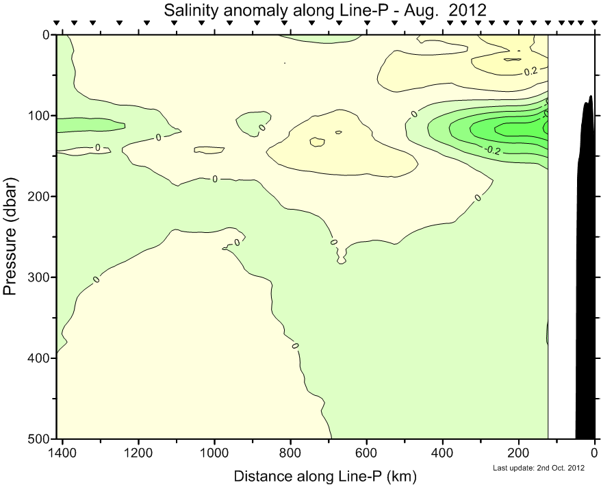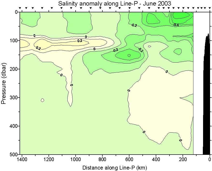 Pour le mois et l'année en cours, les sections sont calculées en utilisant les données disponibles à ce jour. Ces sections sont susceptibles d'être modifiées. Les versions définitives seront publiées lorsque toutes les données seront disponibles. Les anomalies sont calculées par rapport à la climatologie de la ligne P.