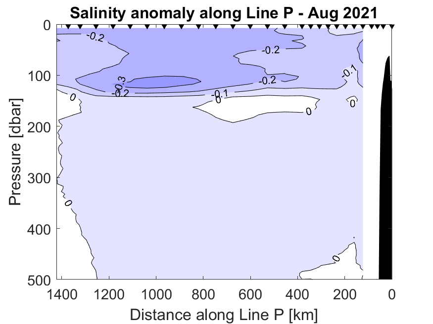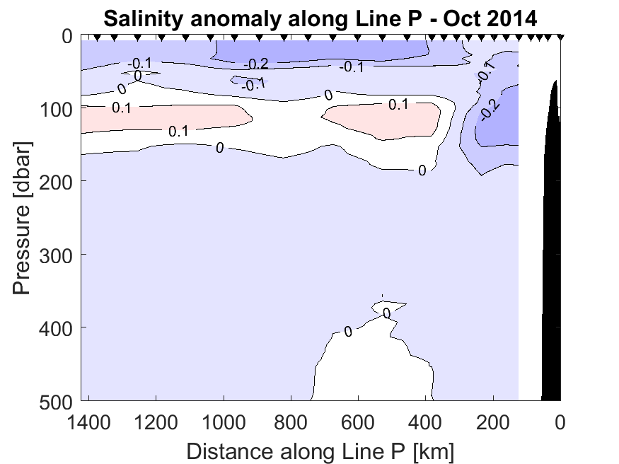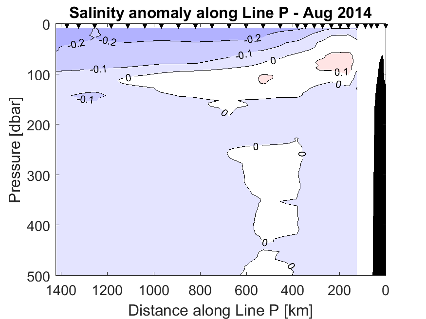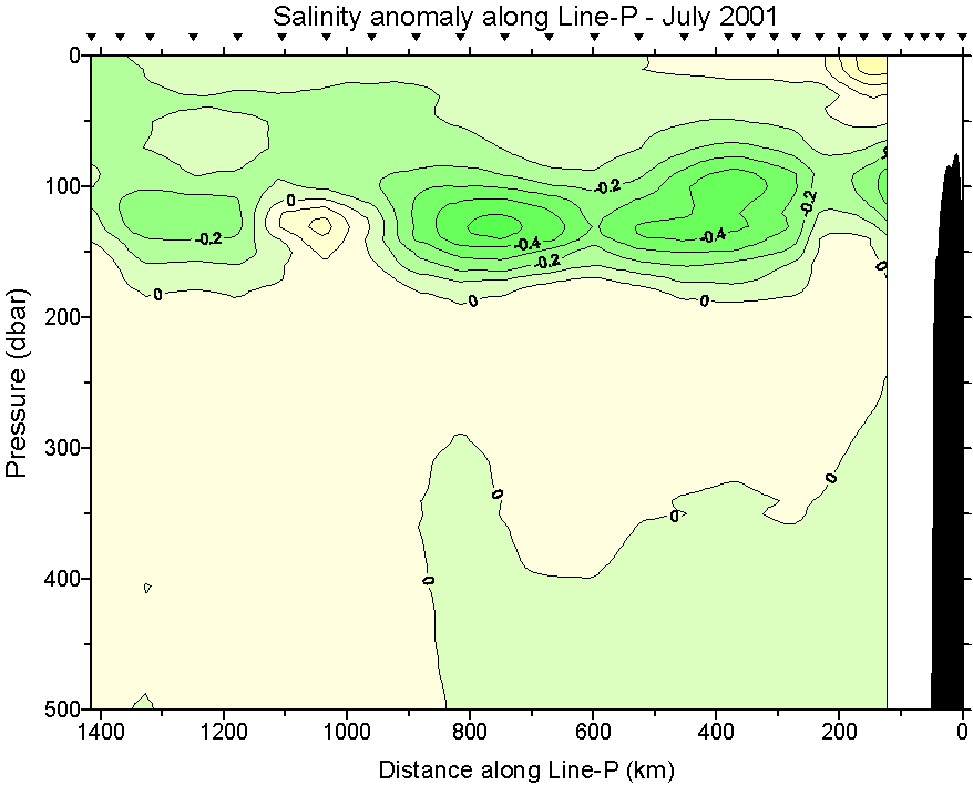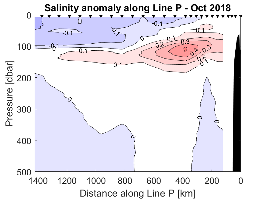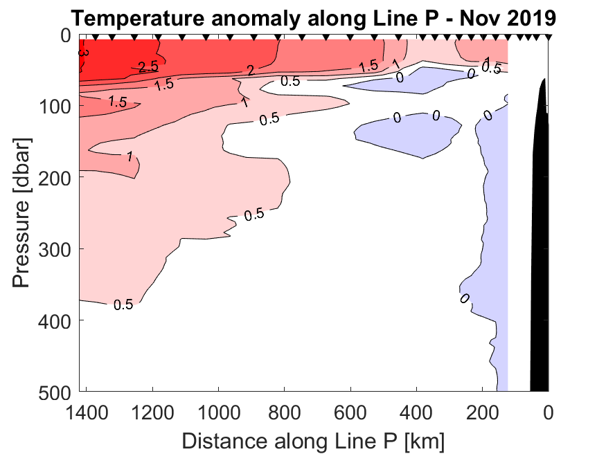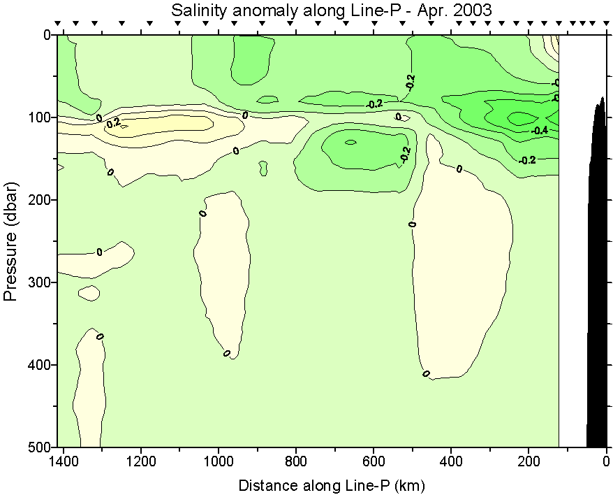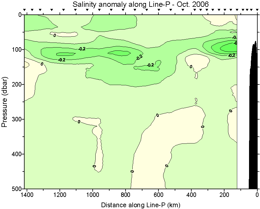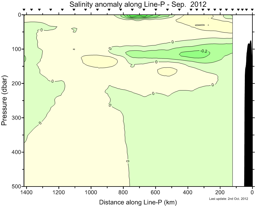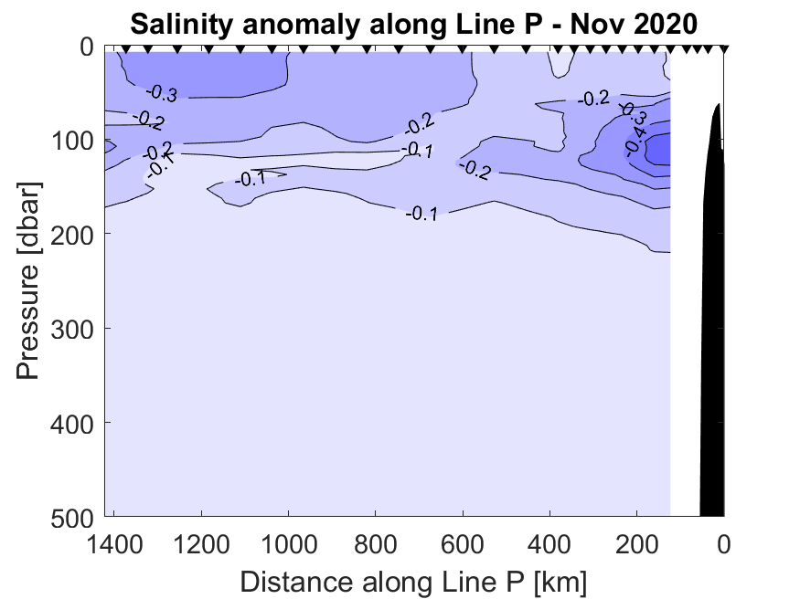 Pour le mois et l'année en cours, les sections sont calculées en utilisant les données disponibles à ce jour. Ces sections sont susceptibles d'être modifiées. Les versions définitives seront publiées lorsque toutes les données seront disponibles. Les anomalies sont calculées par rapport à la climatologie de la ligne P.