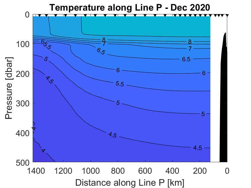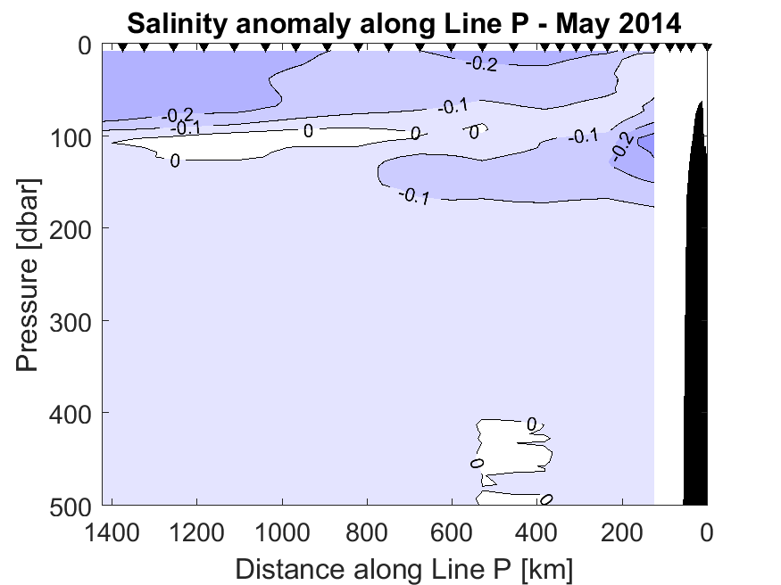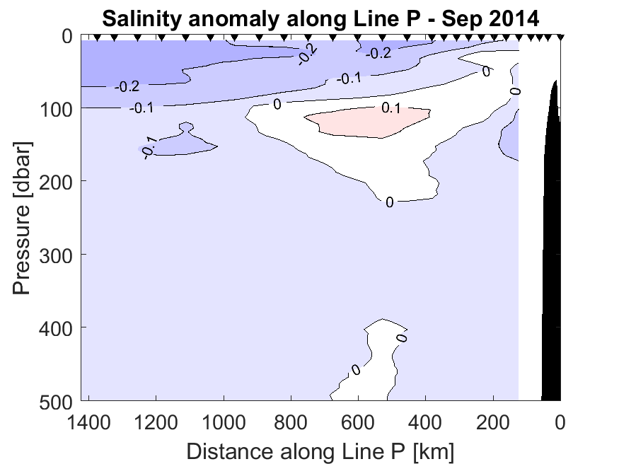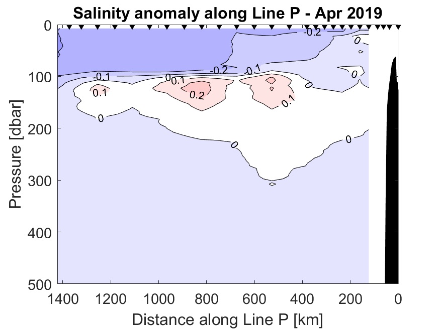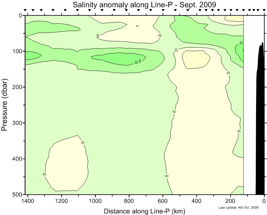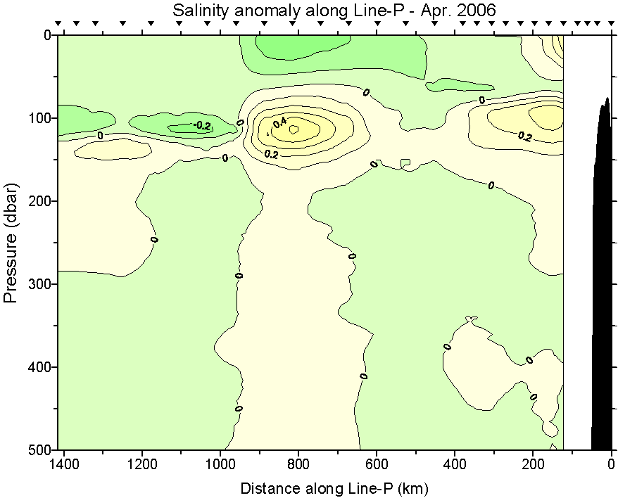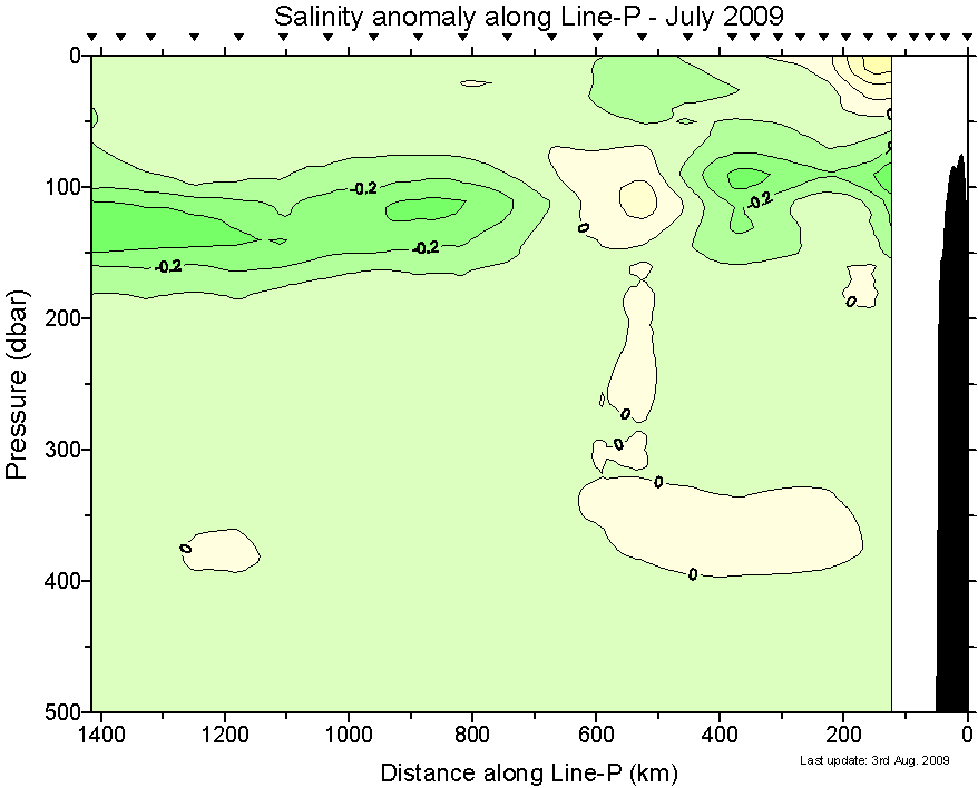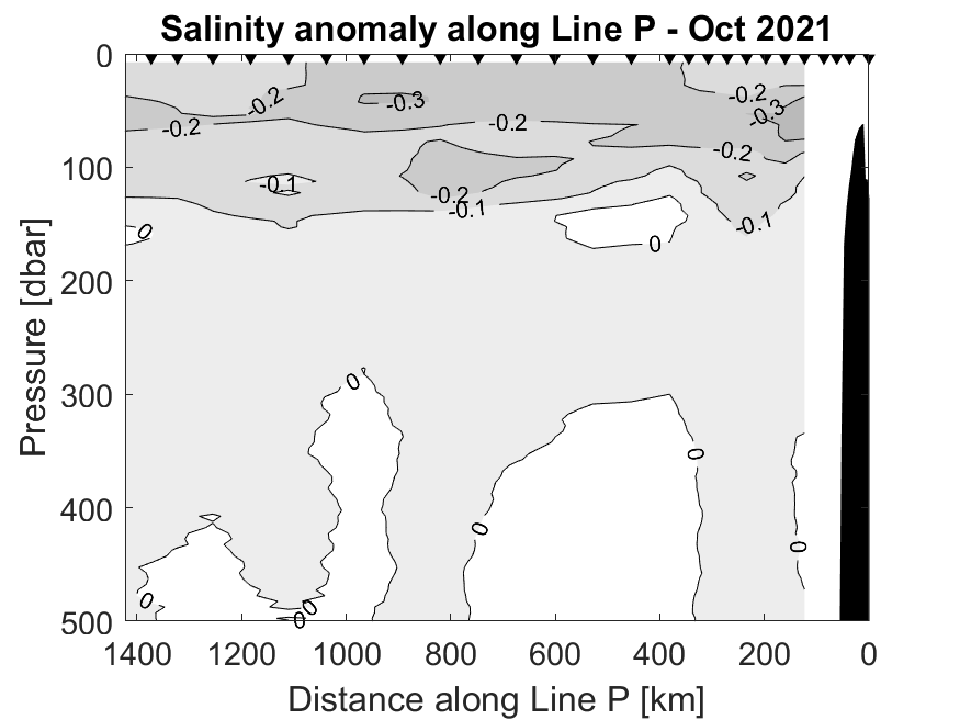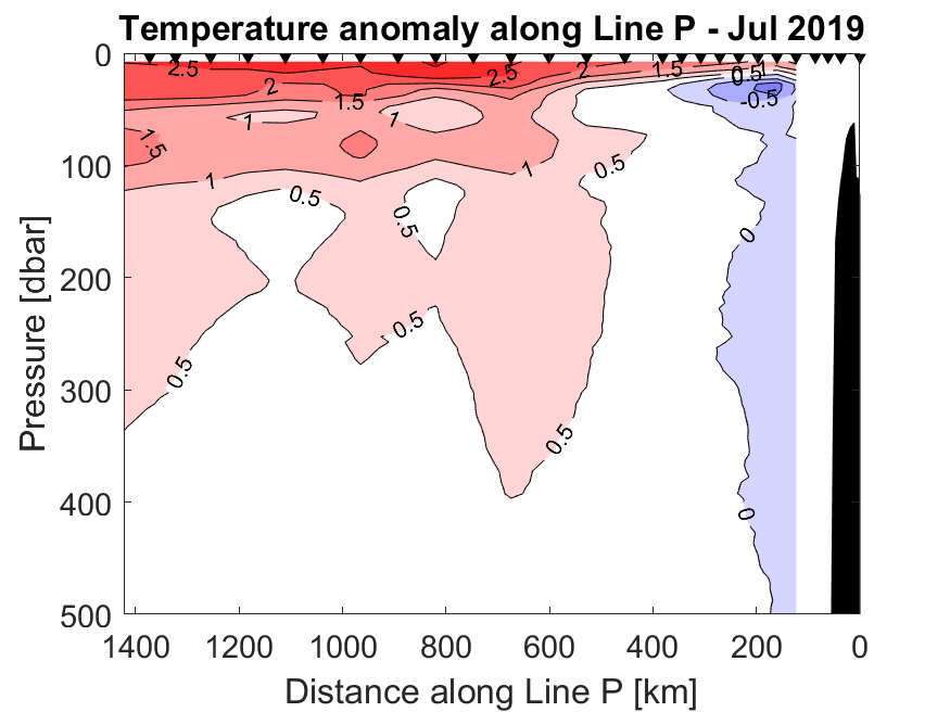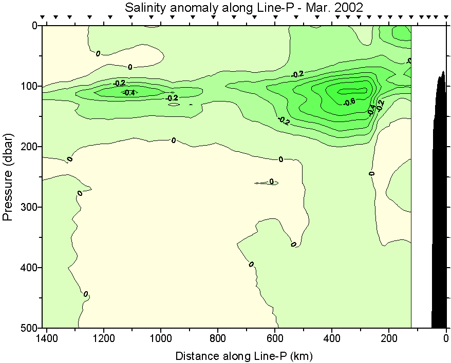 Pour le mois et l'année en cours, les sections sont calculées en utilisant les données disponibles à ce jour. Ces sections sont susceptibles d'être modifiées. Les versions définitives seront publiées lorsque toutes les données seront disponibles. Les anomalies sont calculées par rapport à la climatologie de la ligne P.