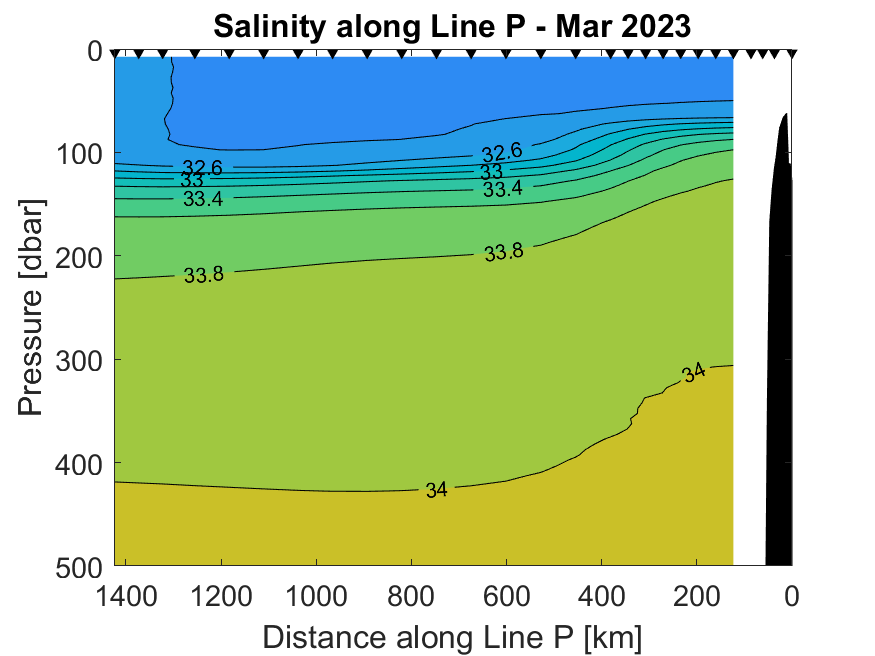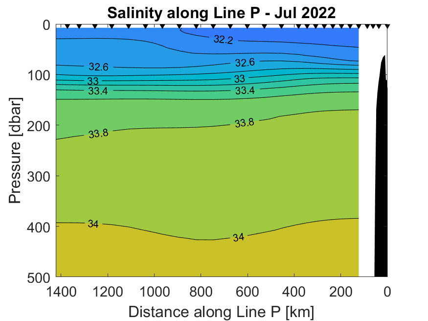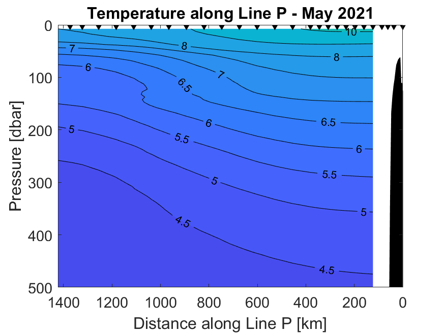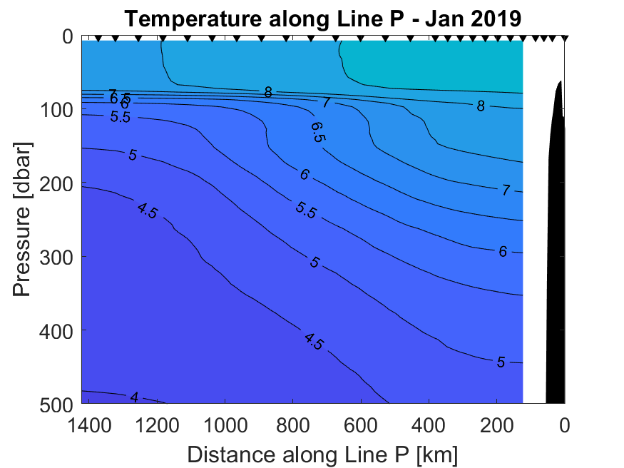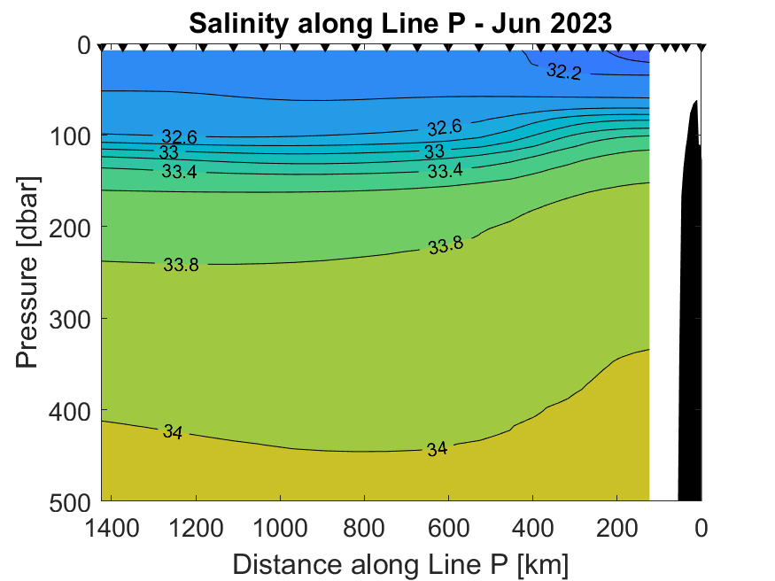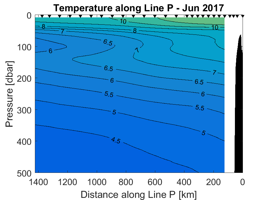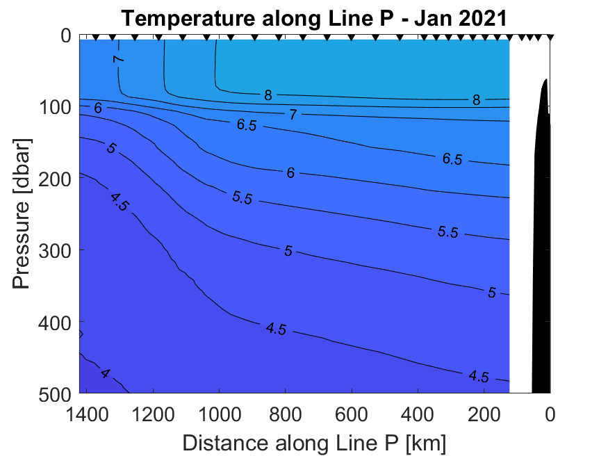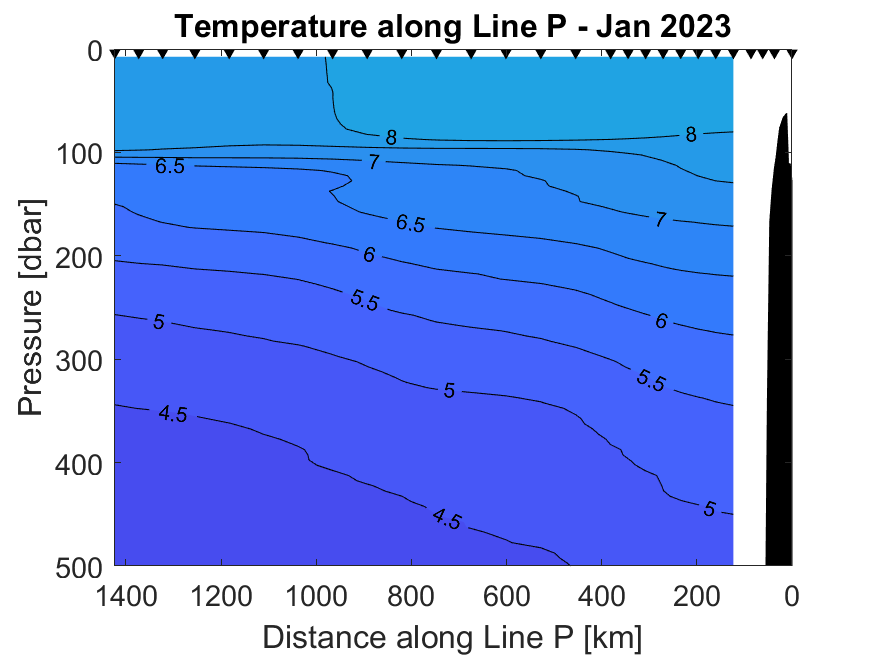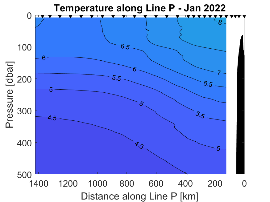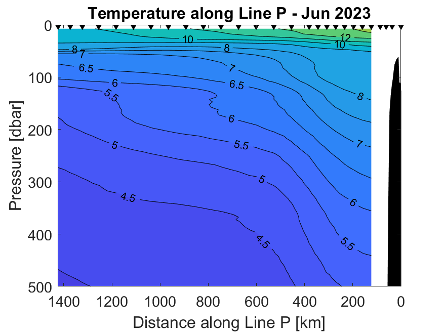 Pour le mois et l'année en cours, les sections sont calculées en utilisant les données disponibles à ce jour. Ces sections sont susceptibles d'être modifiées. Les versions définitives seront publiées lorsque toutes les données seront disponibles. Les anomalies sont calculées par rapport à la climatologie de la ligne P.