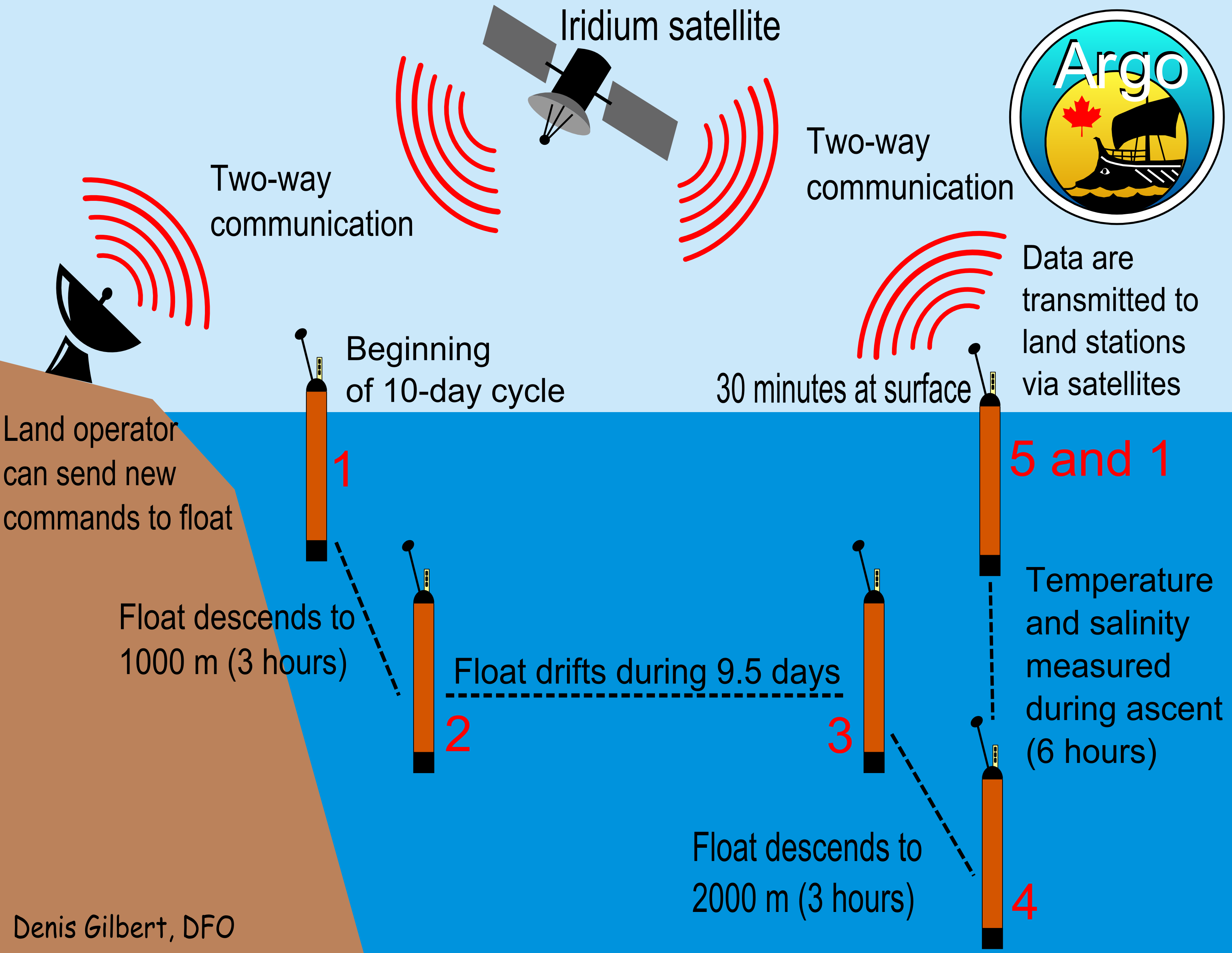 A typical 10-day cycle begins with an Argo float at the sea surface (1). Fluid is pumped from an external bladder to the interior of the float. This reduces the float's buoyancy, which allows it to sink to the pre-determined depth of 1000 m (2) where it freely drifts for the next 9.5 days (3). Additional pumping of fluid from the external bladder allows the float to further sink to 2000 m (4). Next, fluid from the inside of the float is pumped to its external bladder, causing the float to rise while collecting temperature and salinity data. Soon after the float reaches the surface (5), it sends its data to a satellite, which relays the data to a receiving land station. Once the float receives confirmation from the satellite that all data were well-received, it begins a new cycle (1).