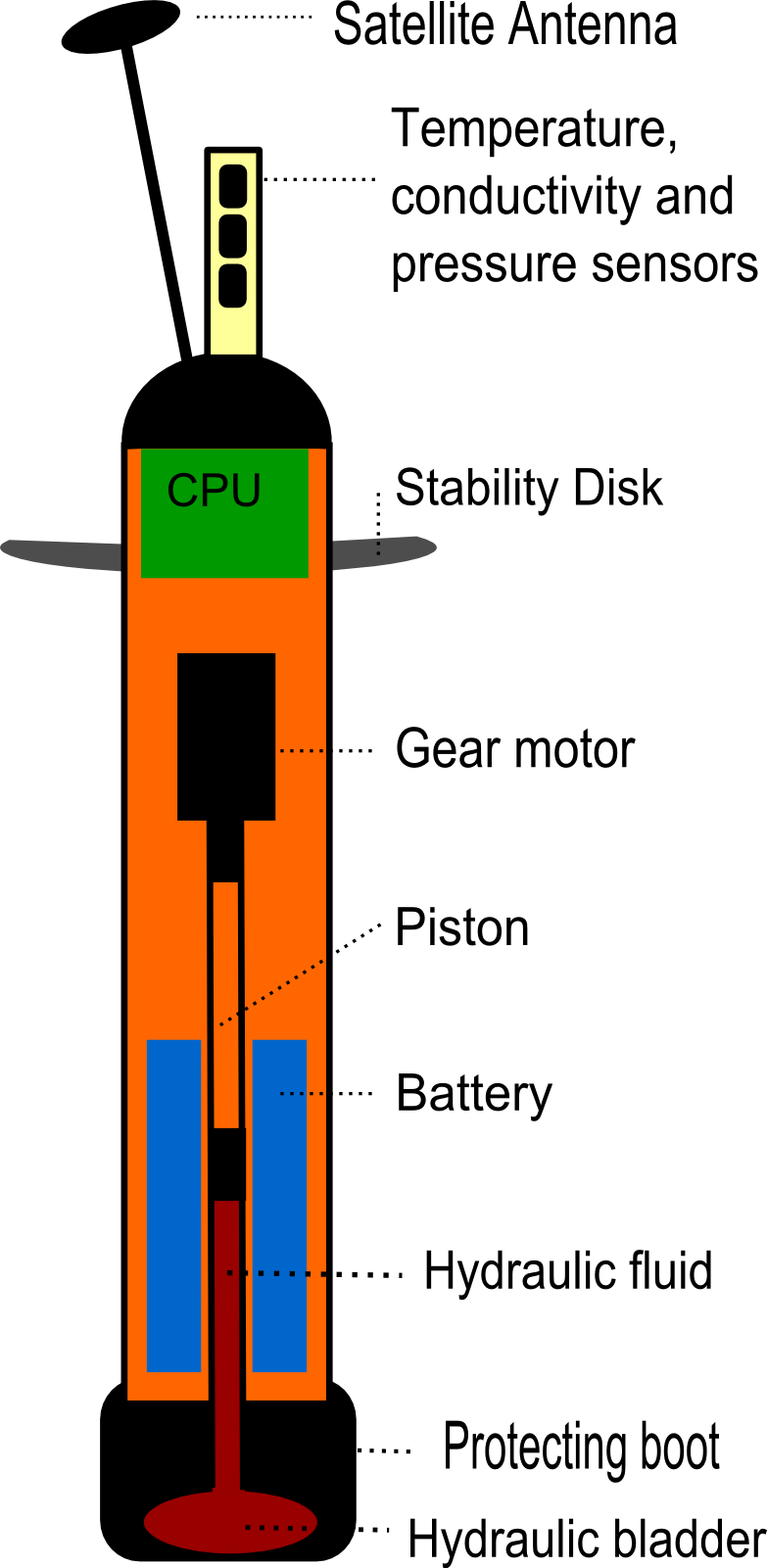 The various sensors of an Argo float are almost always located at the top of the float, where we also find the antenna that allows the exchange of data with satellites. A central processing unit (CPU) contains the float's software. A stability disk helps the float retain a nearly vertical position by damping wave motion at the sea surface. A battery-powered gear motor activates a piston, which allows the pumping of hydraulic fluid from the inside of the float to an external bladder, or vice-versa, allowing the float to either rise or sink. The protecting boot prevents damage to the float in the unlikely event that it would hit the sea floor.